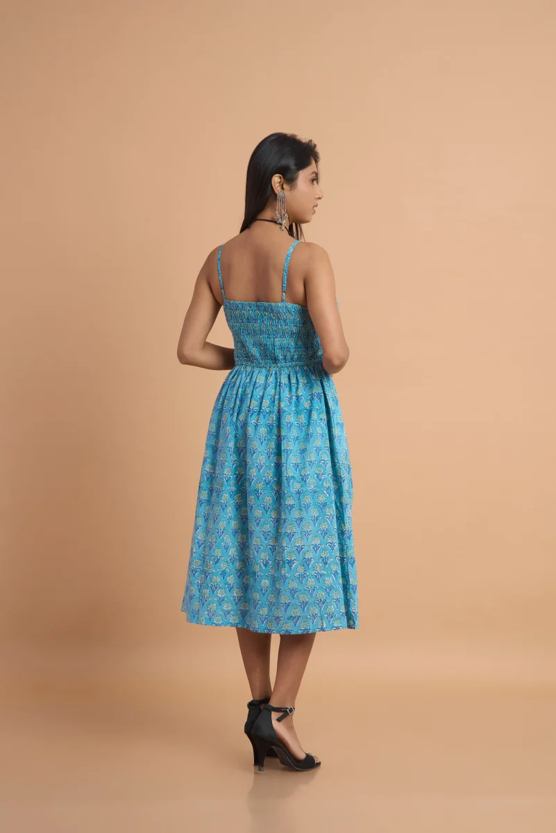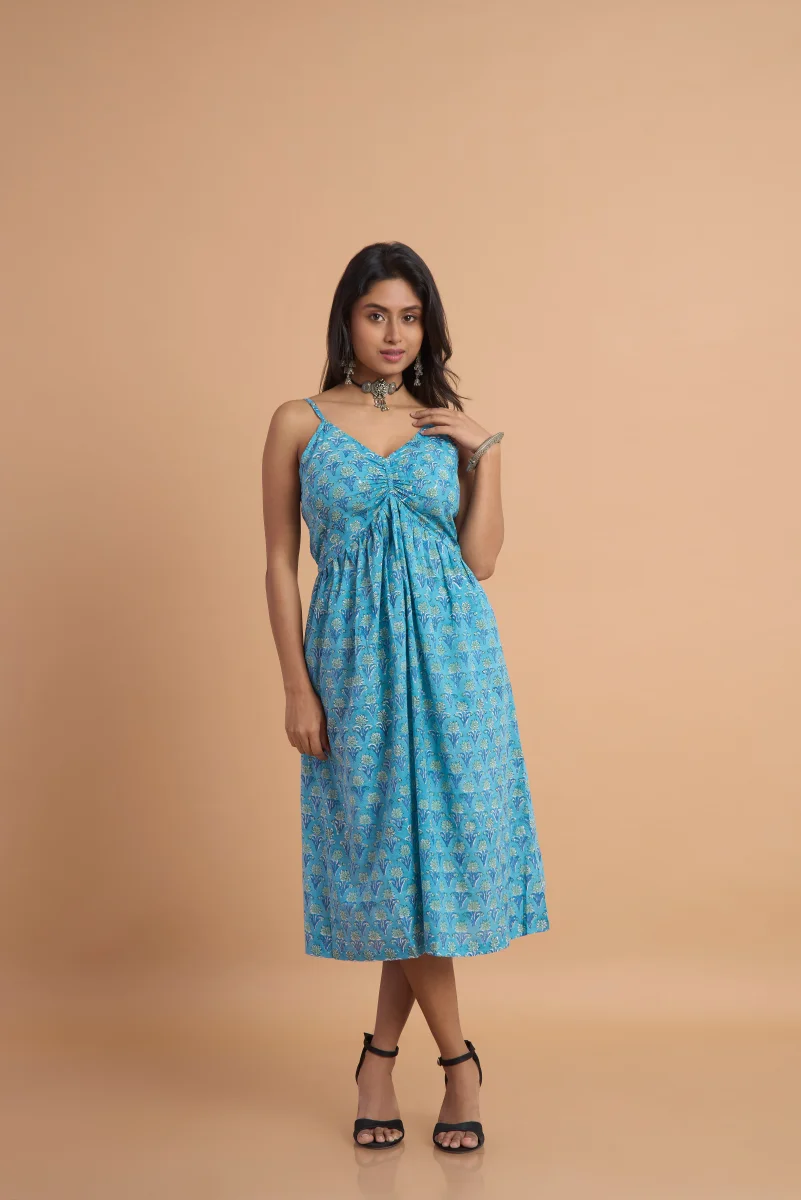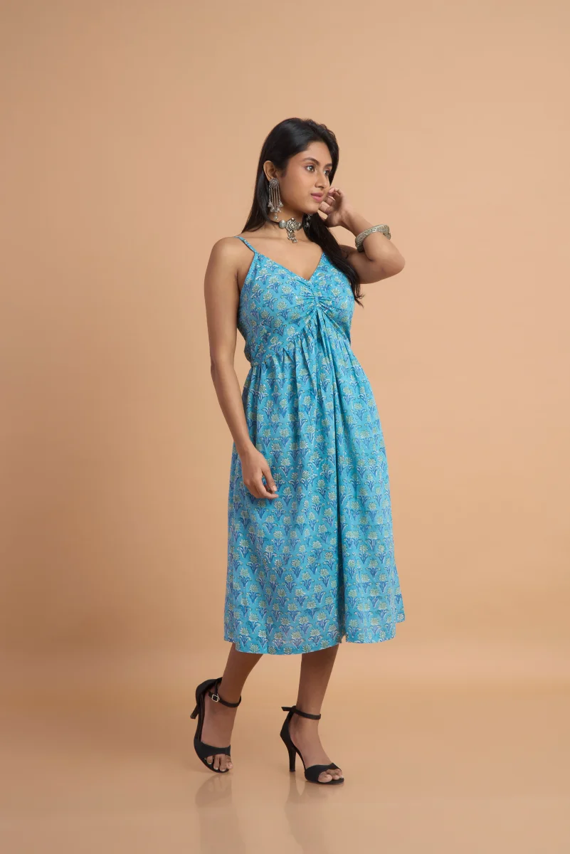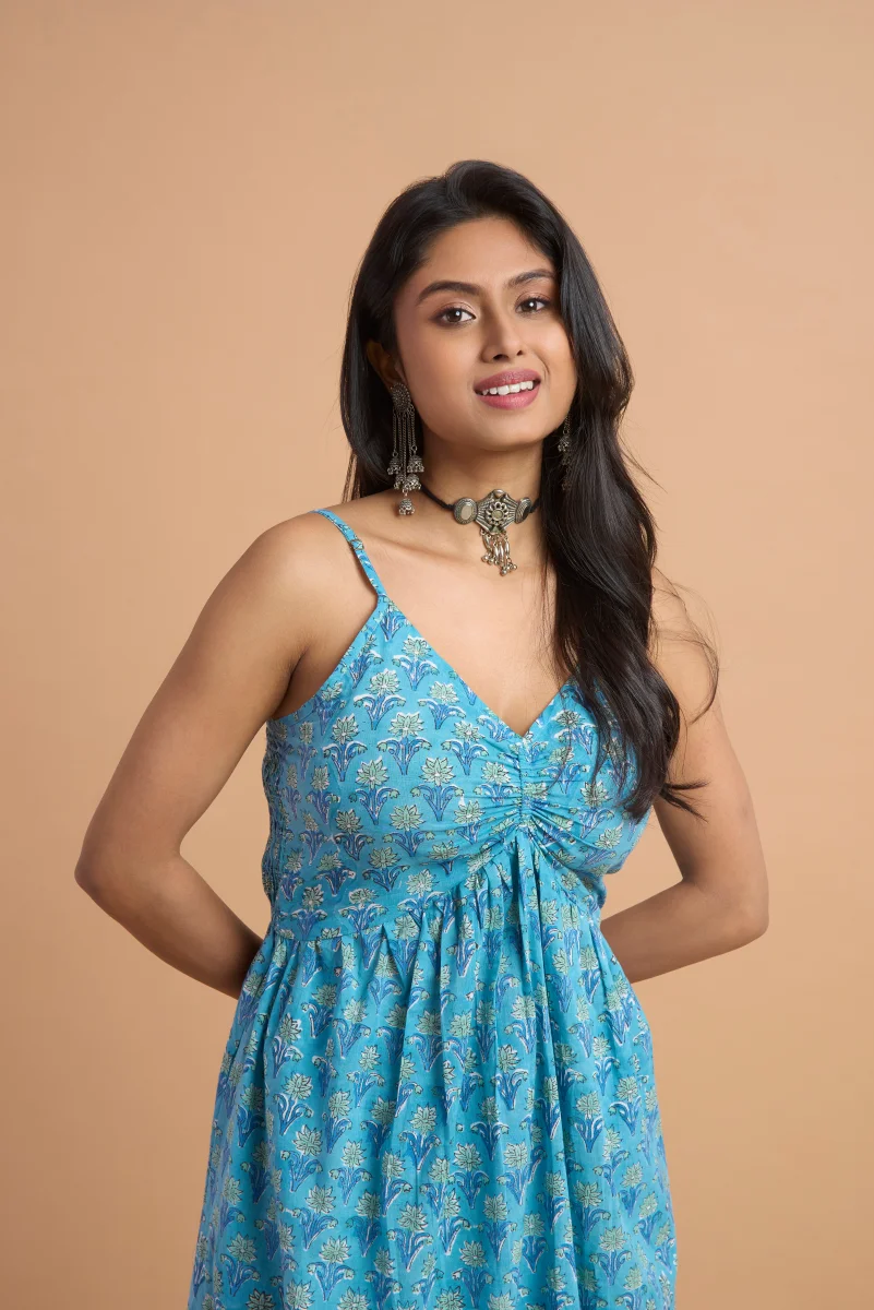 Azure Bloom Hand Block Print Cotton Dress