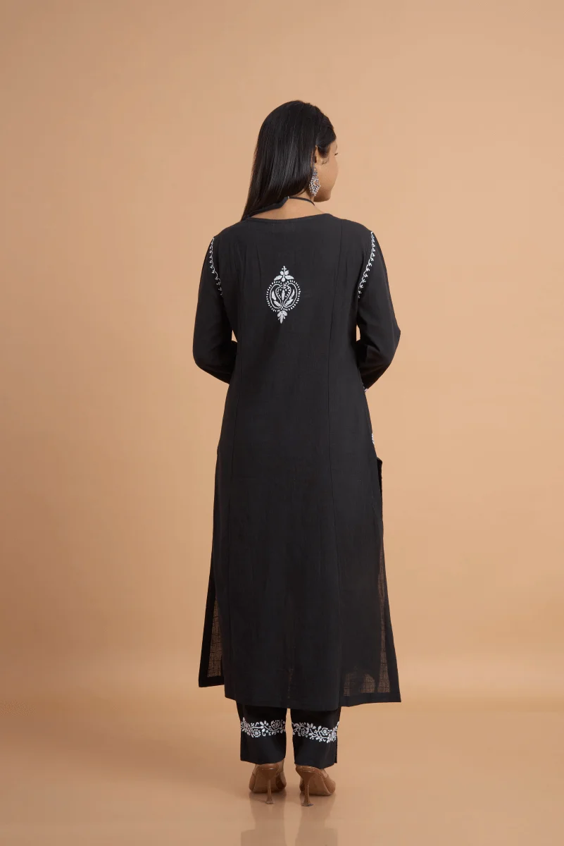 Black Cotton Slub Kurta Set with Hand Chikan Embroidery