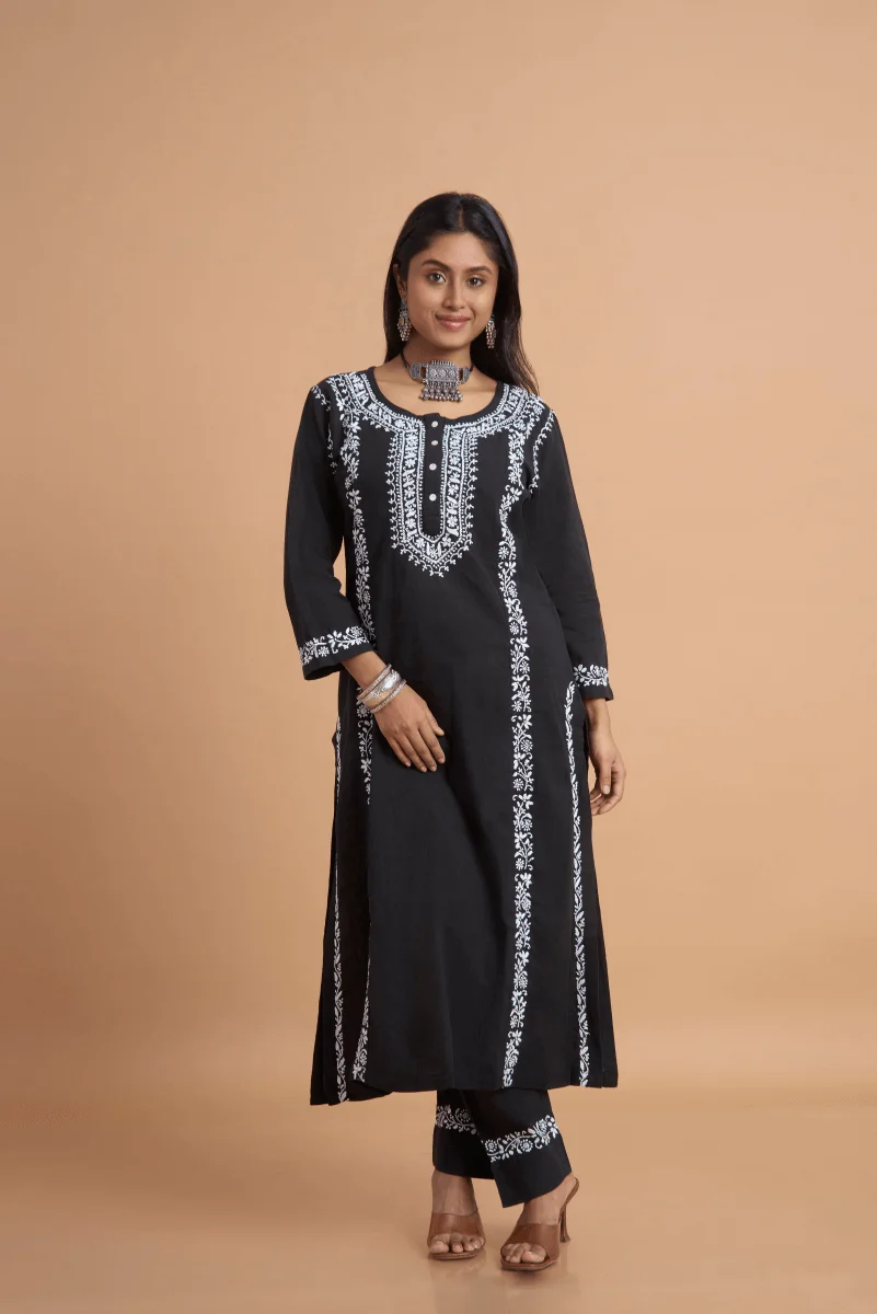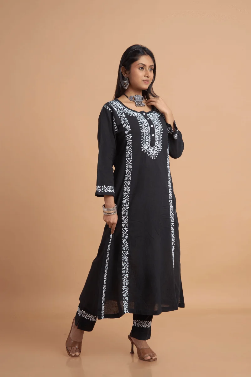 A monochrome statement — this black cotton slub kurta set features intricate white hand Chikankari on the neckline, panels, and cuffs, blending everyday elegance with heritage craft.