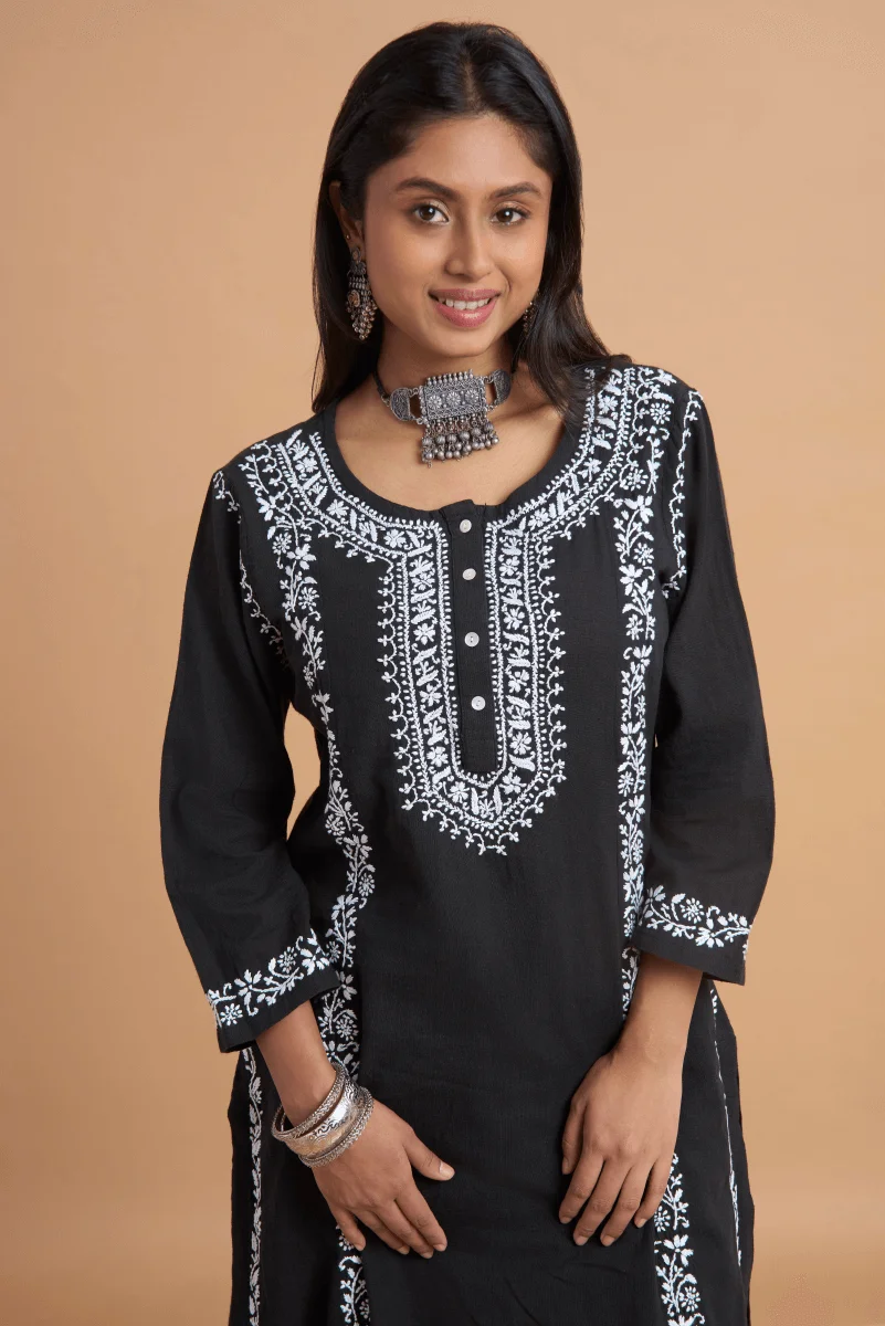 Elevate your daily ethnic wardrobe with this striking black cotton slub kurta set, adorned with timeless white hand Chikankari embroidery. The detailing along the neckline, princess panels, and sleeve hems is painstakingly hand-embroidered by artisans from Lucknow, showcasing traditional motifs like florals and vines with precision.