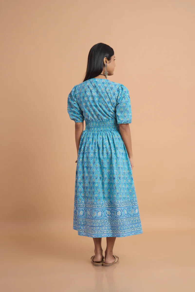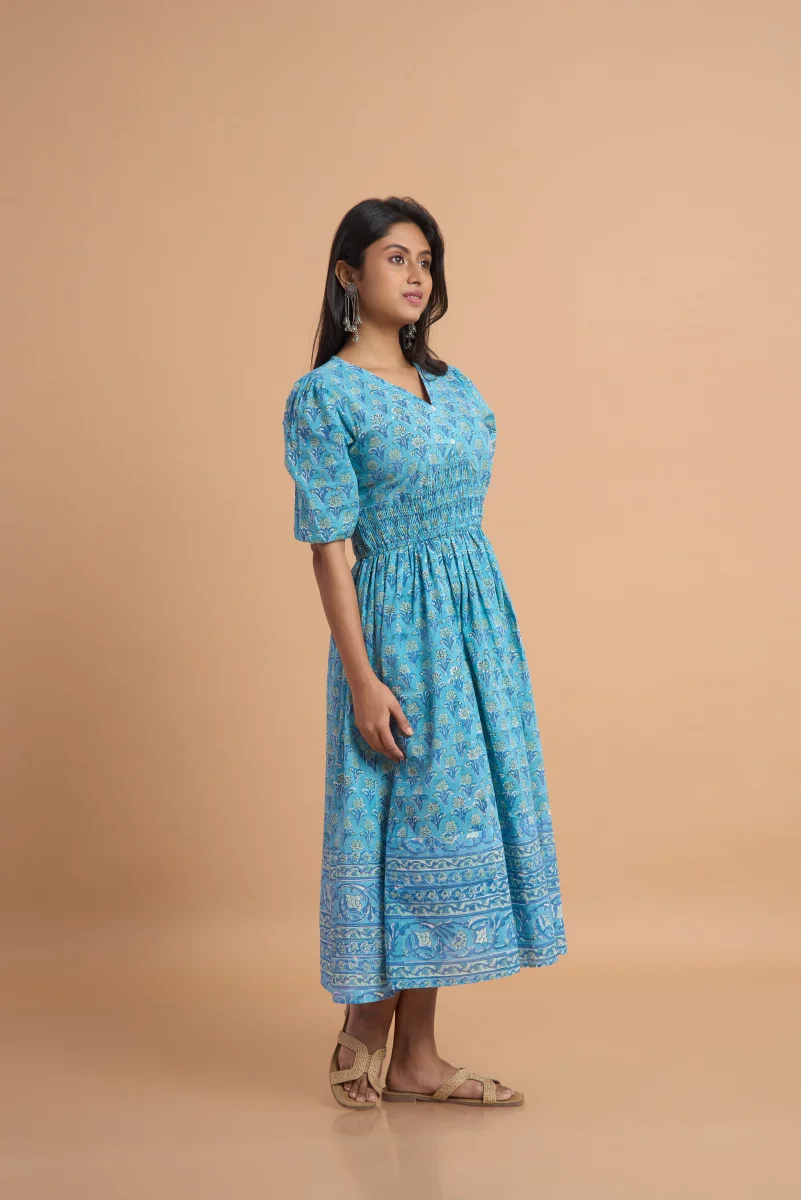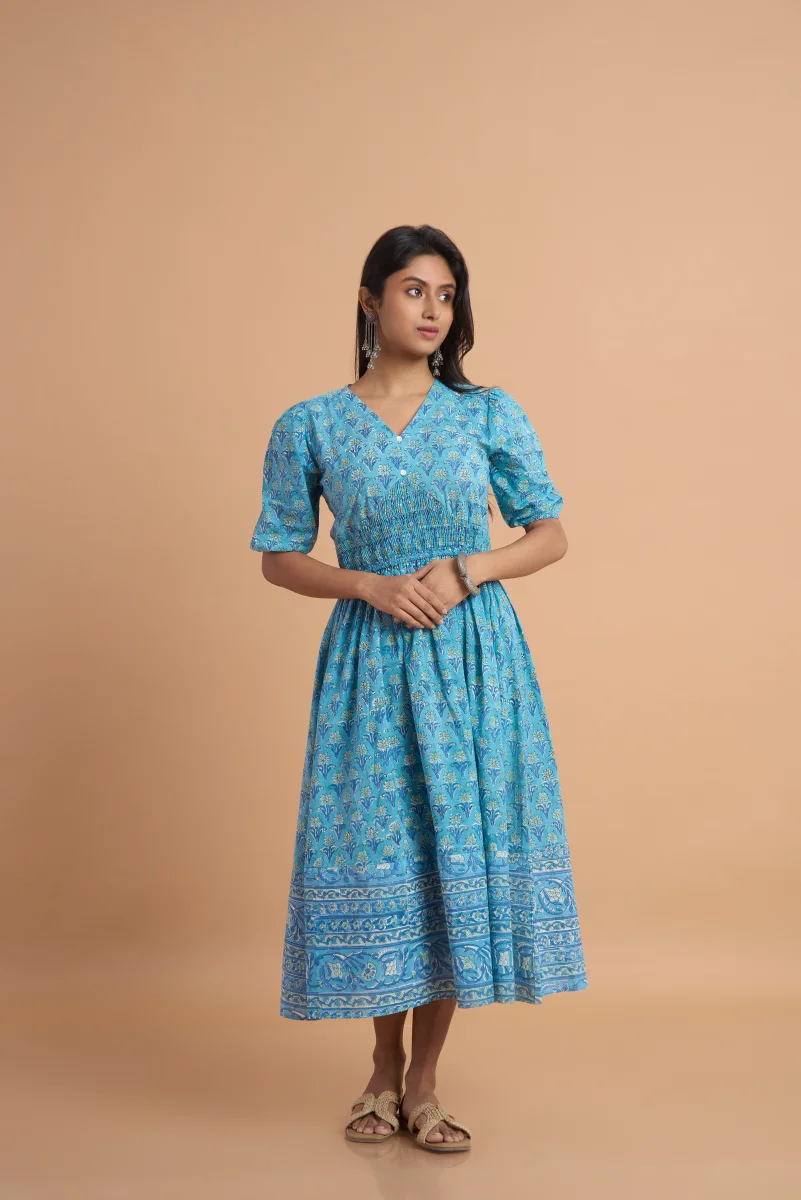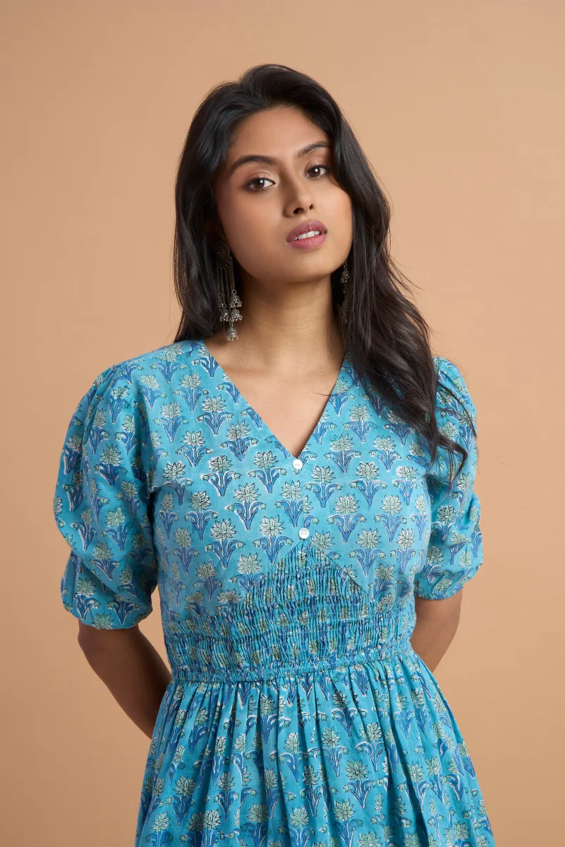 Made from 100% pure cotton, this blue hand block print dress is designed for effortless comfort and timeless style. Featuring delicate traditional motifs, a flattering V-neckline, soft puff sleeves, and a gently smocked waist, it creates a graceful and feminine silhouette. Lightweight and breathable, this dress is ideal for everyday wear, summer outings, or casual gatherings. Style it with ethnic jewellery or simple sandals for a refined, handcrafted look.