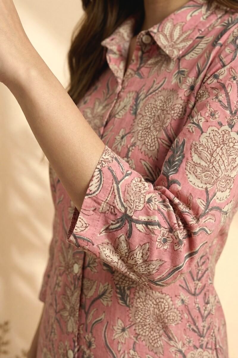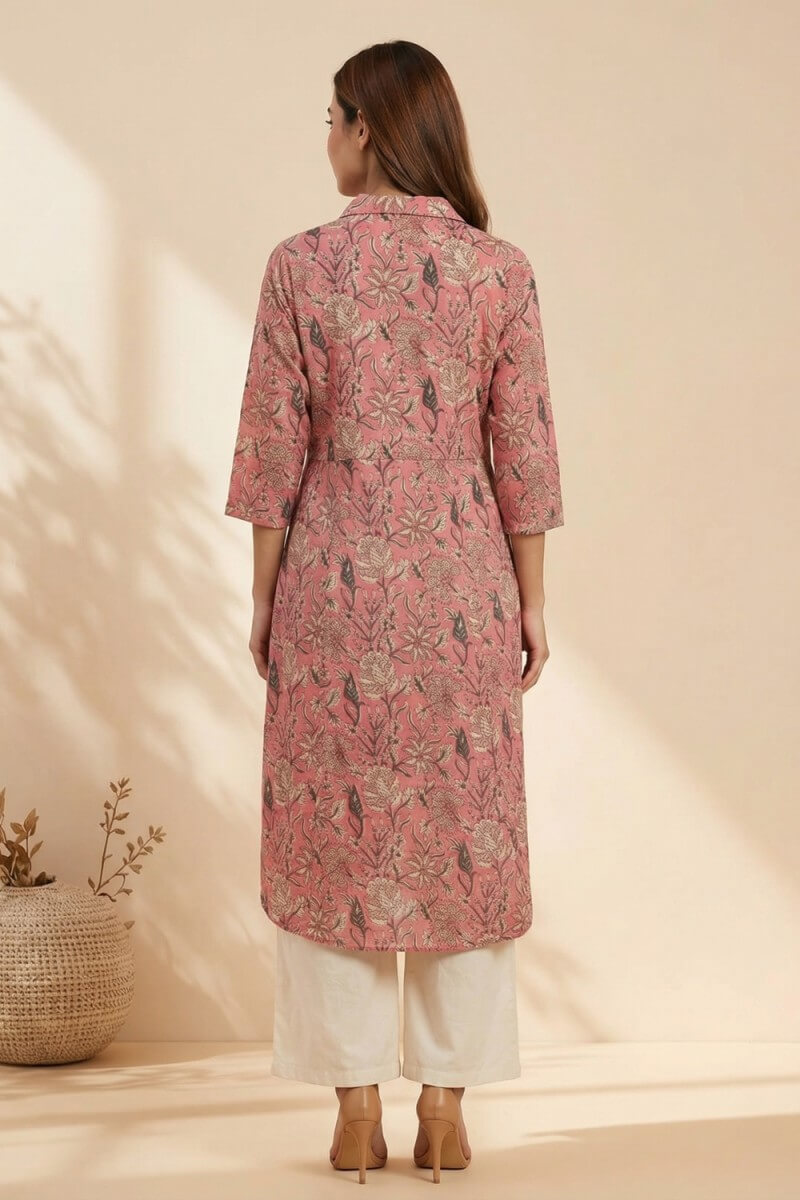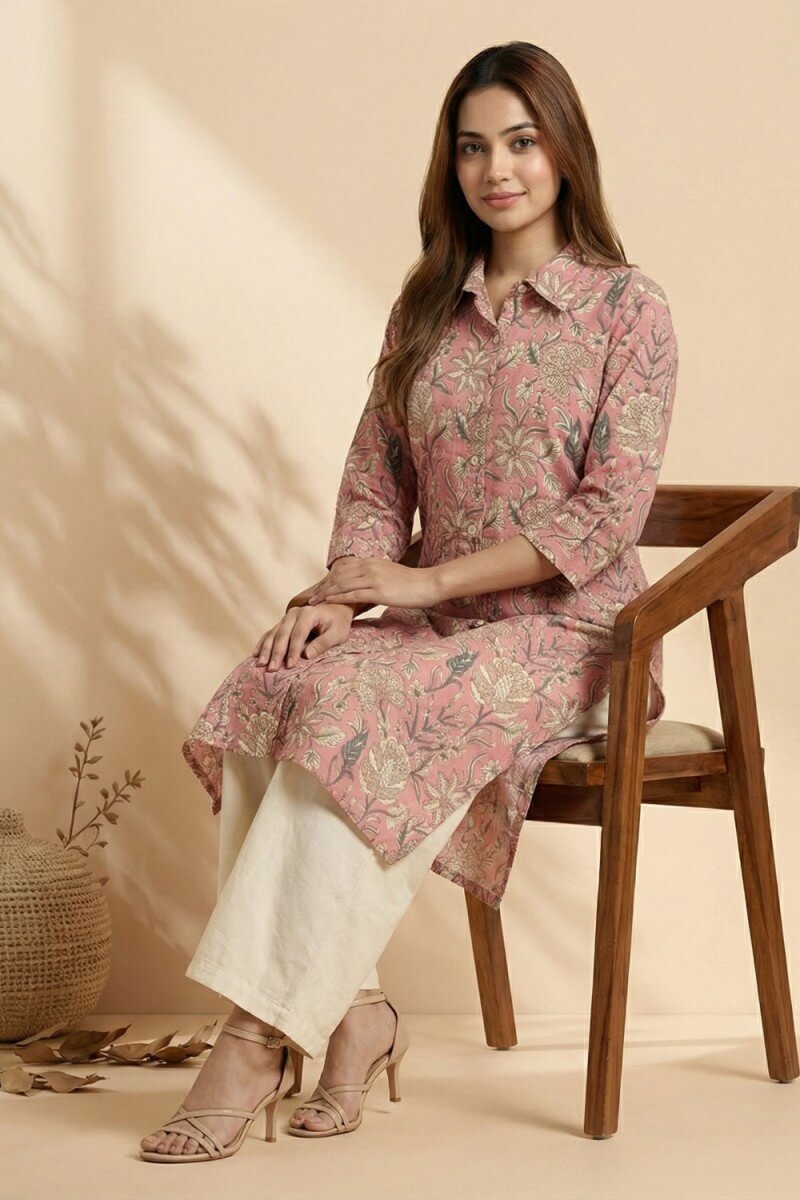 Delicate and effortlessly elegant, this 100% cotton kurta is adorned with intricate hand block prints in a soft blush pink hue. The breathable fabric ensures all-day comfort, while the detailed floral motifs add a touch of timeless charm. Designed with a classic silhouette and front button detailing, it offers a flattering and easy fit for everyday wear. Perfect for both work and casual outings, this kurta pairs beautifully with straight pants or palazzos, bringing together comfort, craftsmanship, and understated sophistication.