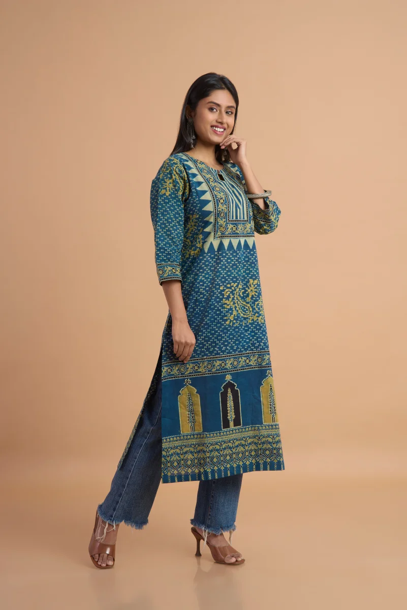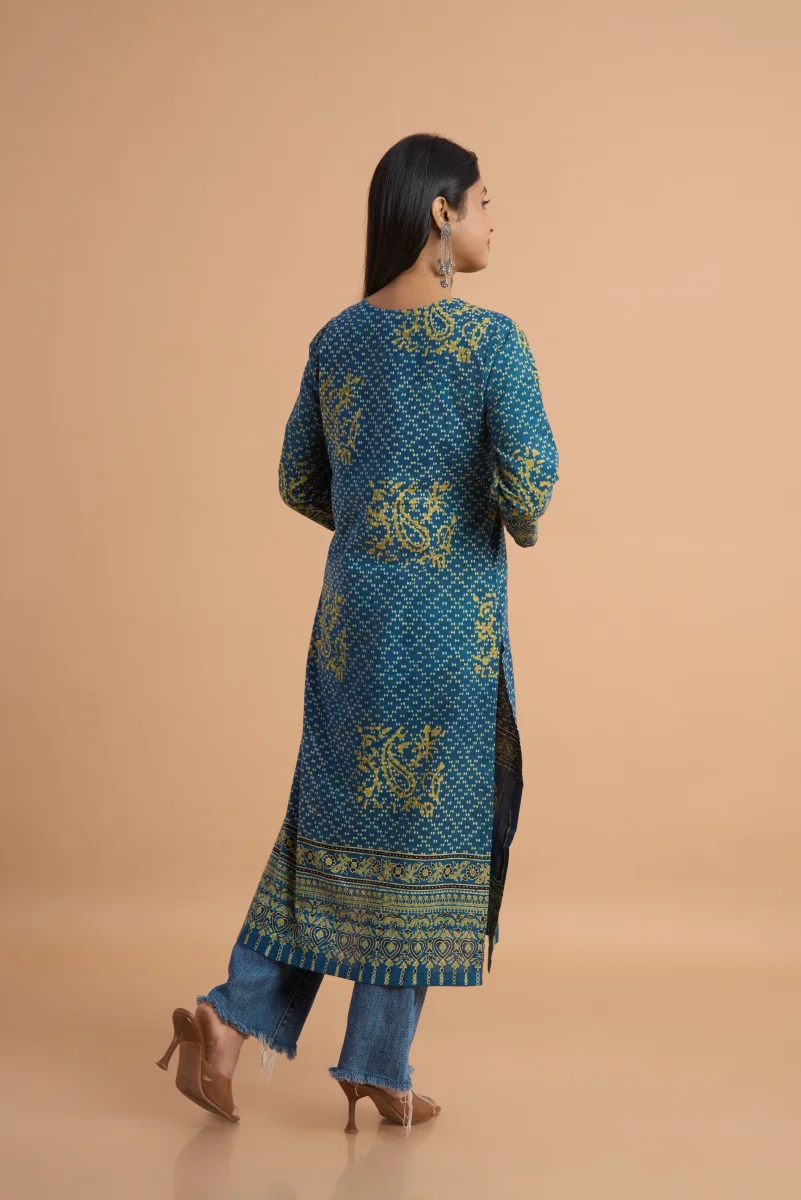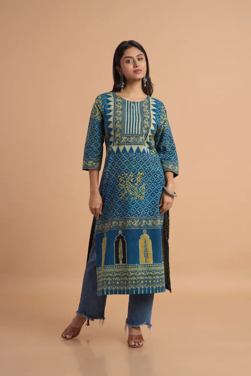 Experience the timeless charm of Ajrakh craftsmanship with this elegant Indigo Hand Ajrakh Printed Cotton Kurta. Made from 100% pure cotton, it offers natural breathability, comfort, and a beautifully soft drape—perfect for everyday wear. The kurta features traditional Ajrakh motifs arranged in a refined placement print, showcasing intricate geometric and floral patterns across the bodice, sleeves, and hemline. The rich indigo base enhances the depth of the hand-block print, giving the piece a classic yet contemporary appeal. Designed in a straight silhouette with three-quarter sleeves, this kurta blends heritage artistry with modern simplicity. Perfect for work, casual outings, festive styling, or pairing with indigo pants for a coordinated look.