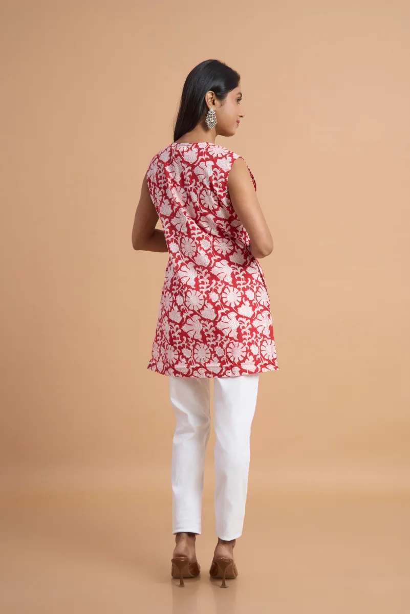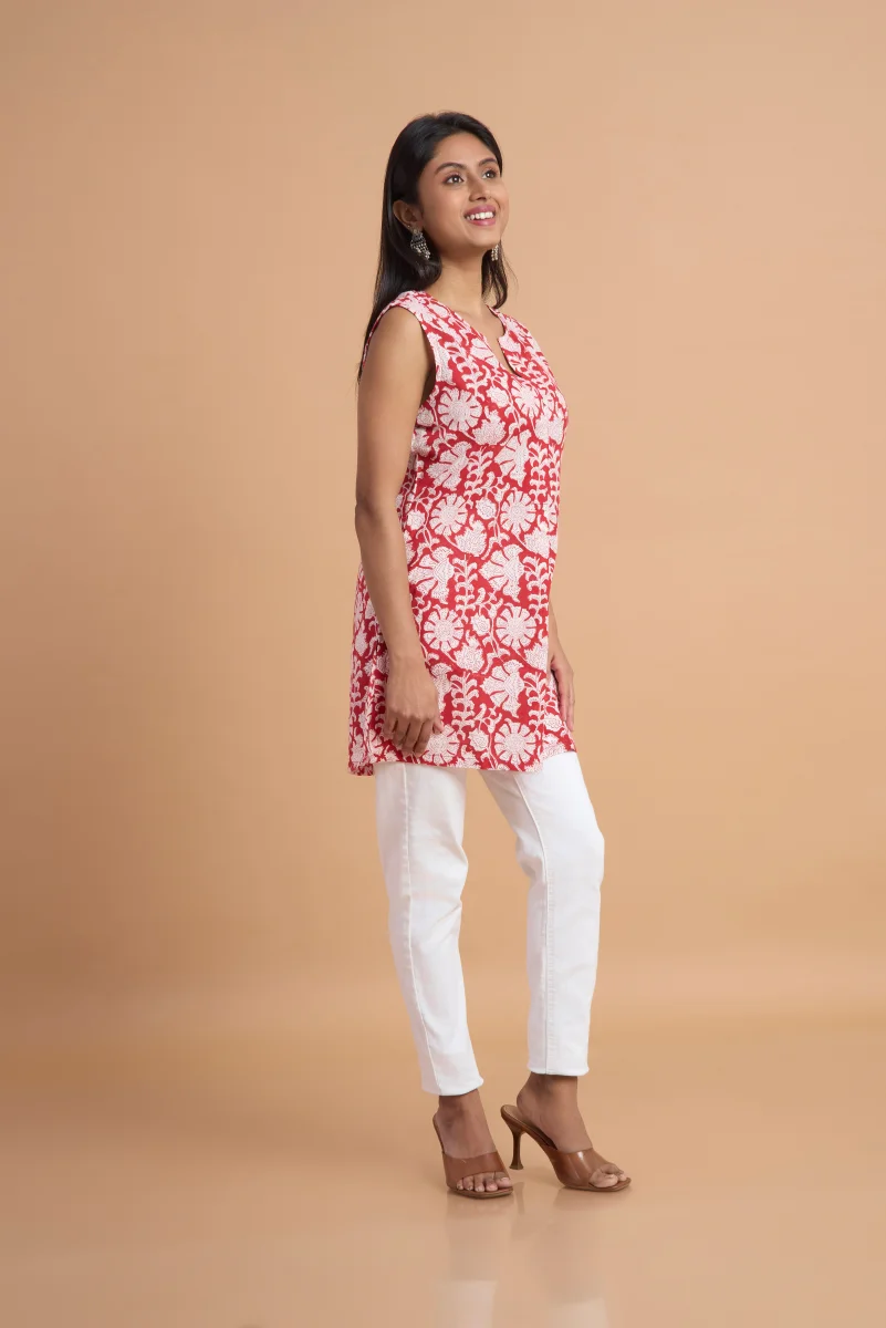 Step into effortless elegance with this vibrant hand block printed sleeveless tunic top, crafted using traditional wooden block techniques. The striking red floral and geometric pattern stands out beautifully against the white base, showcasing the richness of authentic Rajasthani craftsmanship. Designed in a flattering A-line silhouette, the top features a refined notch neckline and a breezy, sleeveless cut—perfect for summer days, casual outings, or easy everyday comfort. The lightweight fabric ensures a soft drape, while the lively print adds a fresh, youthful vibe to your look. Pair it with white pants, denims, or layered accessories for a chic Indo-fusion style.