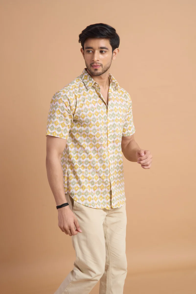 Add a touch of artisanal charm to your wardrobe with this Hand Block Print Cotton Half Sleeve Shirt, crafted from 100% pure cotton for all-day comfort and breathability. The natural cotton fabric feels soft on the skin while ensuring excellent airflow, making it perfect for warm-weather wear.