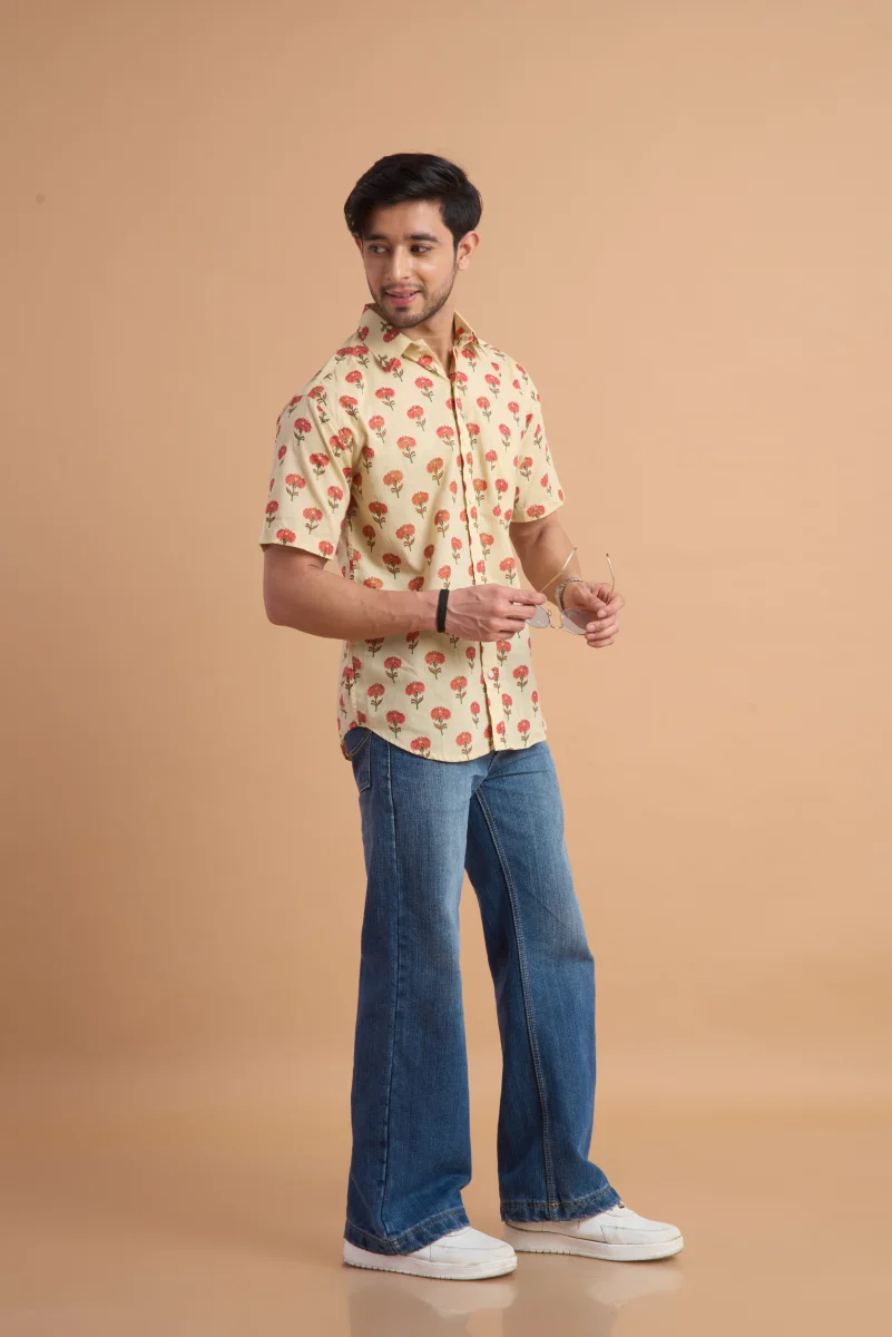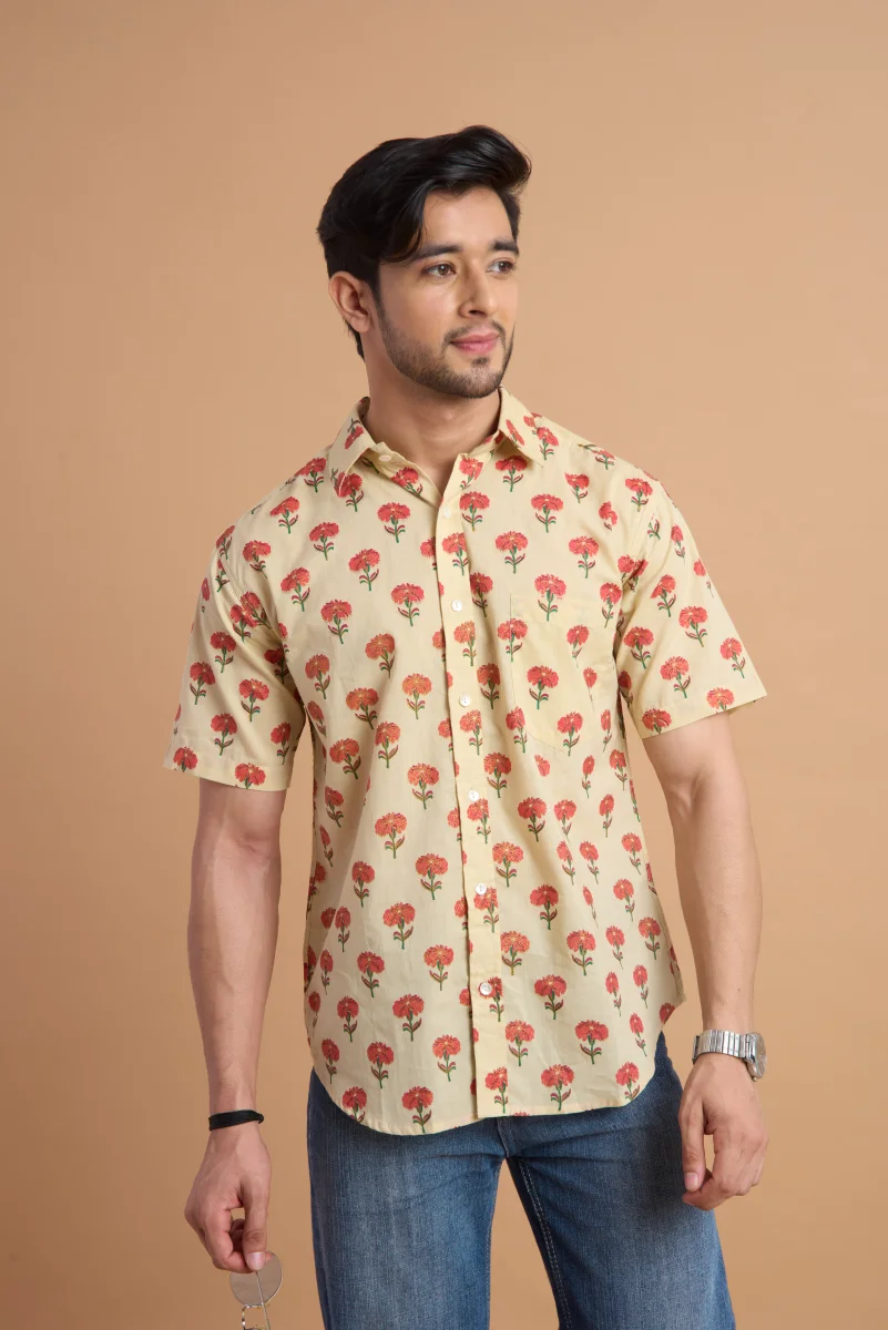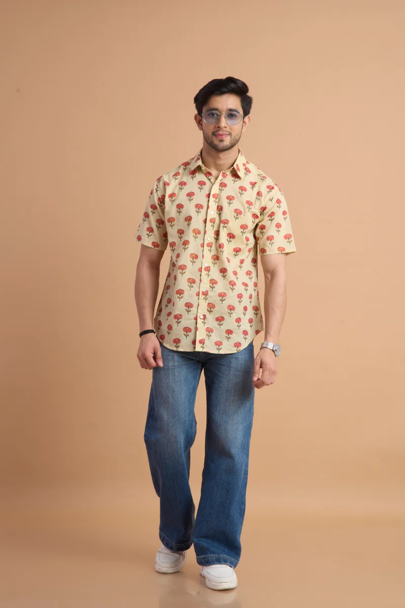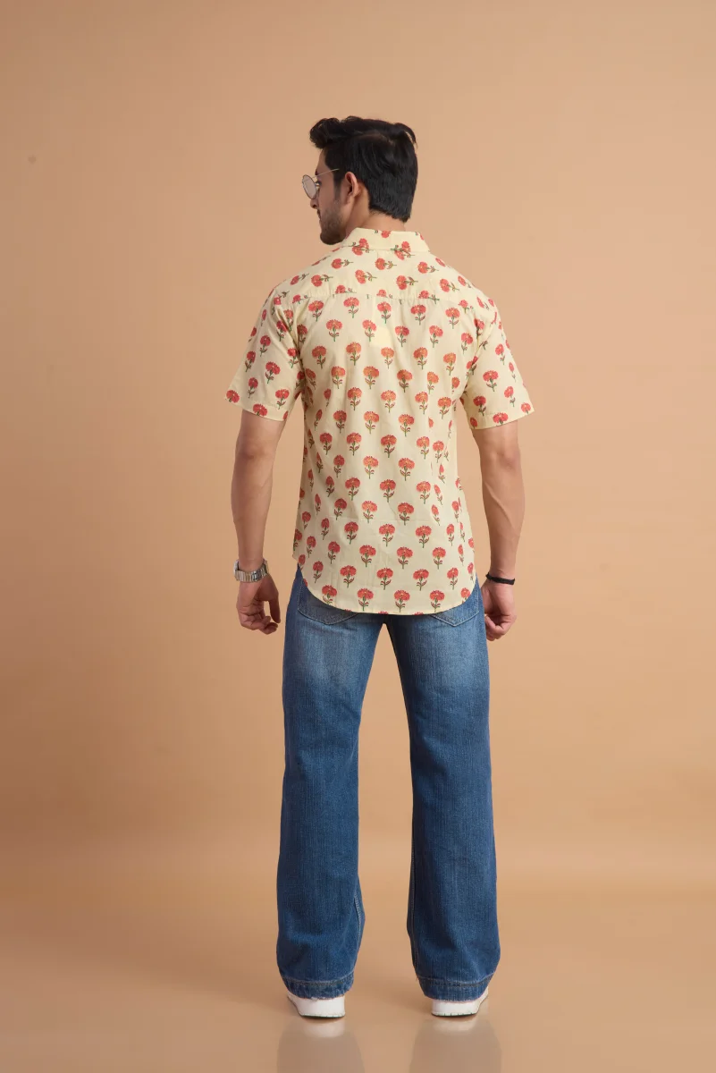 Featuring traditional hand block printing, this shirt showcases intricate patterns that reflect timeless craftsmanship and cultural elegance. Designed with a classic button-down front, a neat collar, and a relaxed yet structured fit, it effortlessly blends comfort with distinctive style. Ideal for casual outings, vacations, and laid-back gatherings, this shirt pairs effortlessly with jeans or chinos for a relaxed, stylish look.