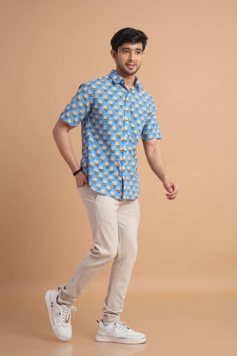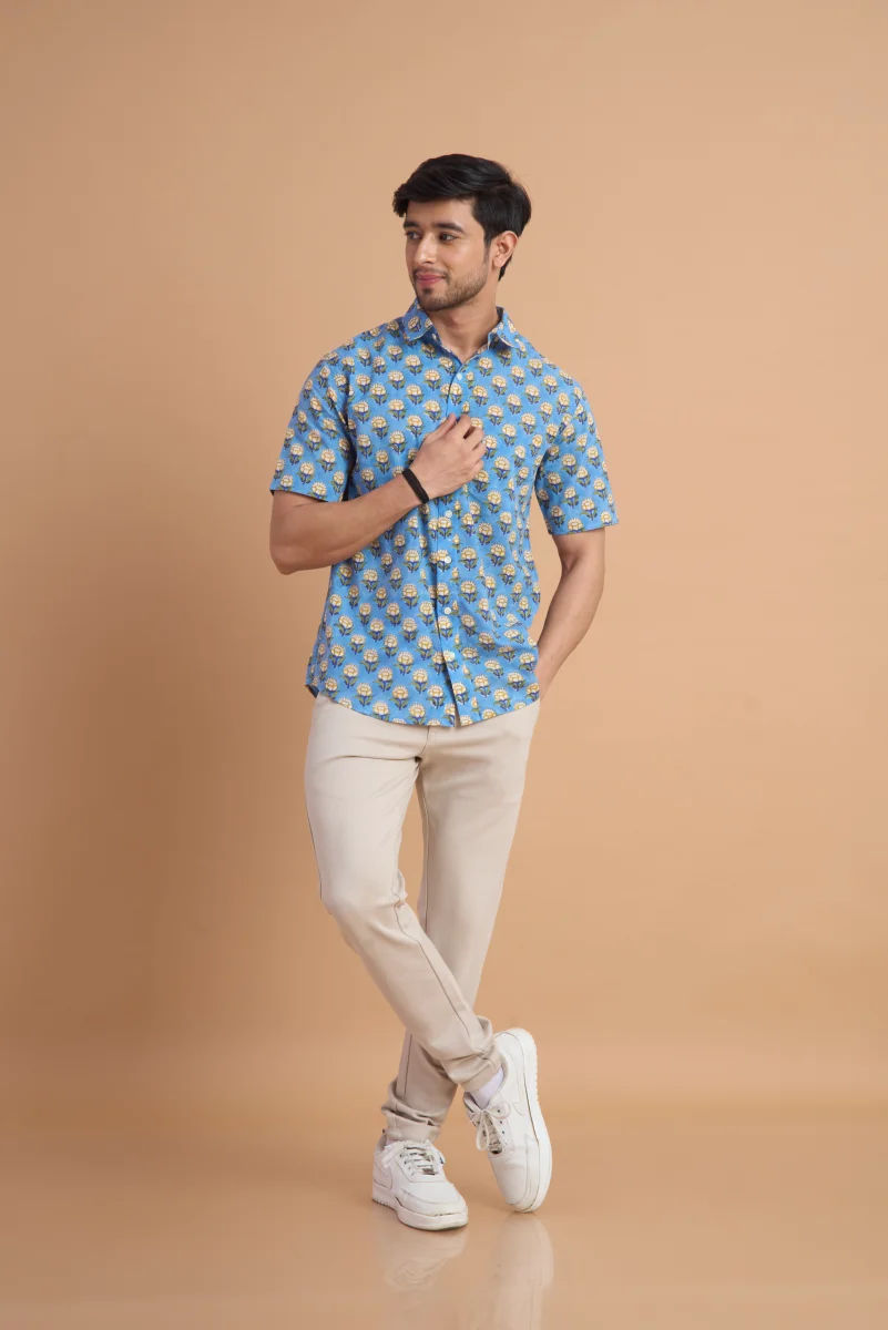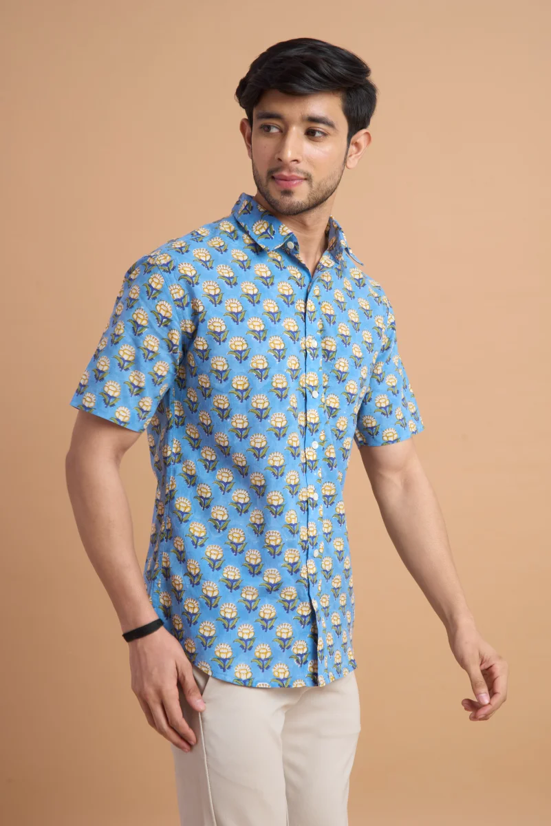 Featuring traditional hand block printing, this shirt showcases intricate patterns that reflect timeless craftsmanship and cultural elegance. Designed with a classic button-down front, a neat collar, and a relaxed yet structured fit, it effortlessly blends comfort with distinctive style. Ideal for casual outings, vacations, and laid-back gatherings, this shirt pairs effortlessly with jeans or chinos for a relaxed, stylish look.
