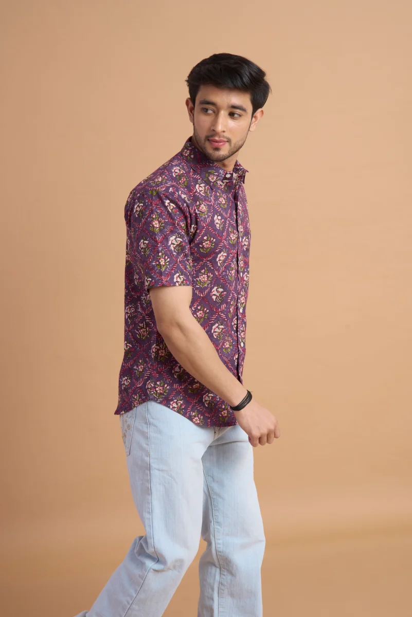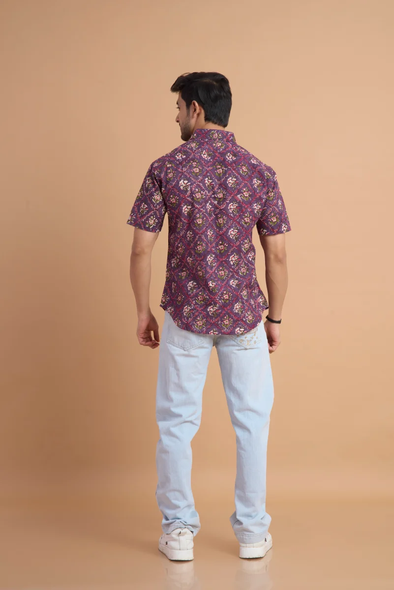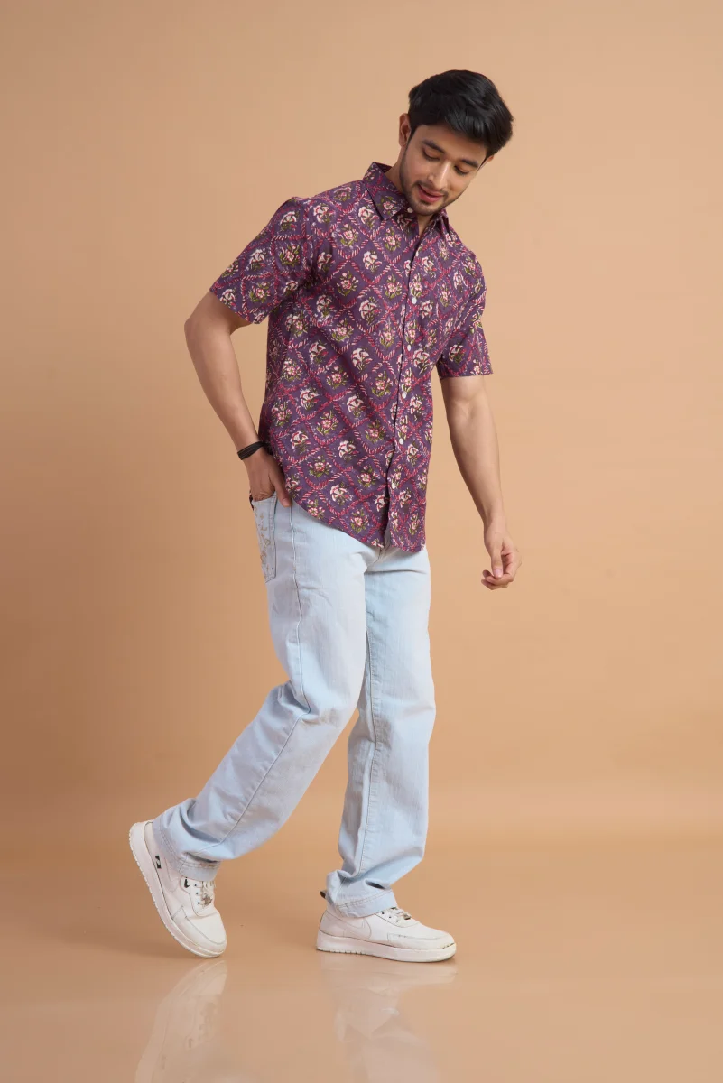 Add a touch of artisanal charm to your wardrobe with this Hand Block Print Cotton Half Sleeve Shirt, crafted from 100% pure cotton for all-day comfort and breathability. The natural cotton fabric feels soft on the skin while ensuring excellent airflow, making it perfect for warm-weather wear.
