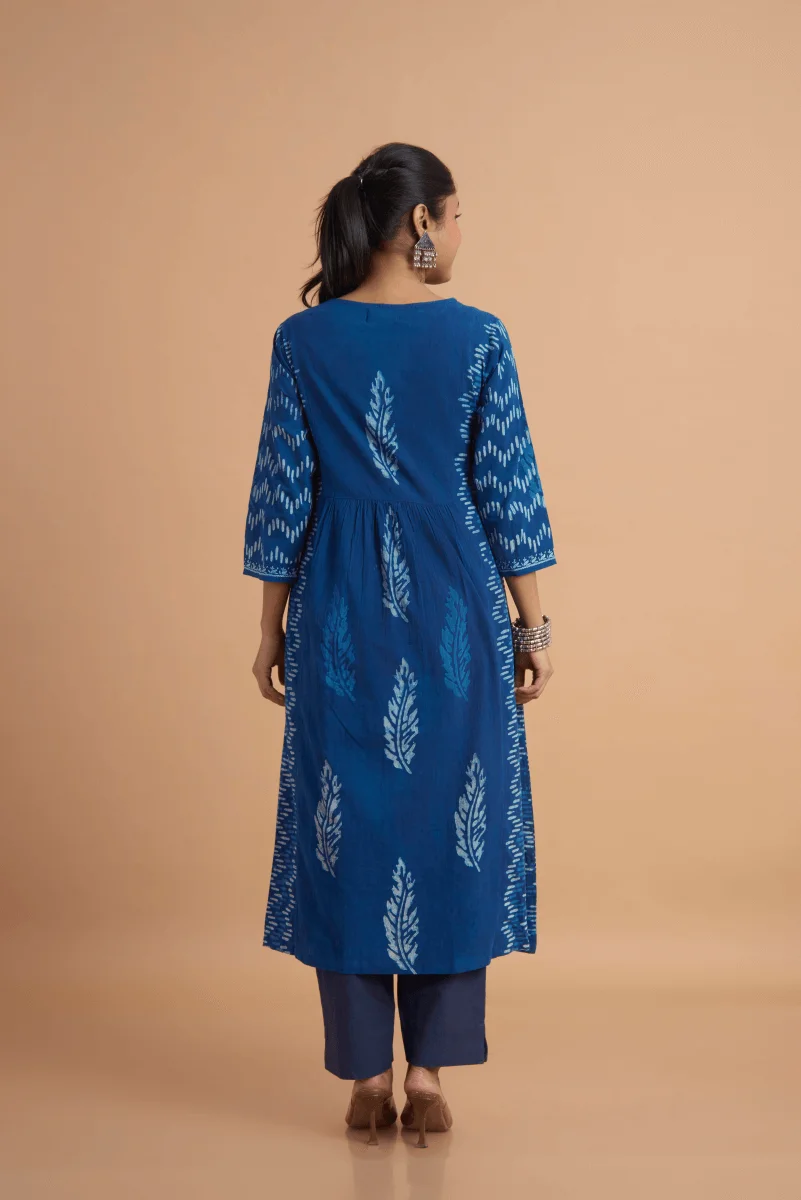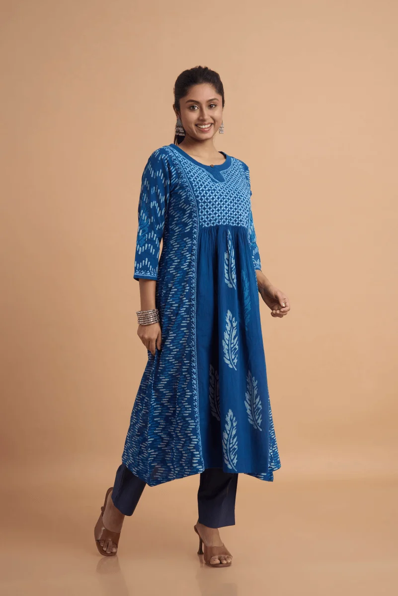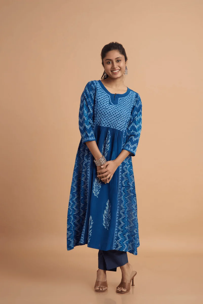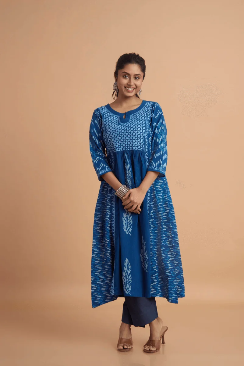 A perfect confluence of heritage crafts — this indigo cotton dress features delicate hand Chikan embroidery paired with block-printed placement motifs, creating an elegant fusion of Lucknowi finesse and Rajasthani boldness.