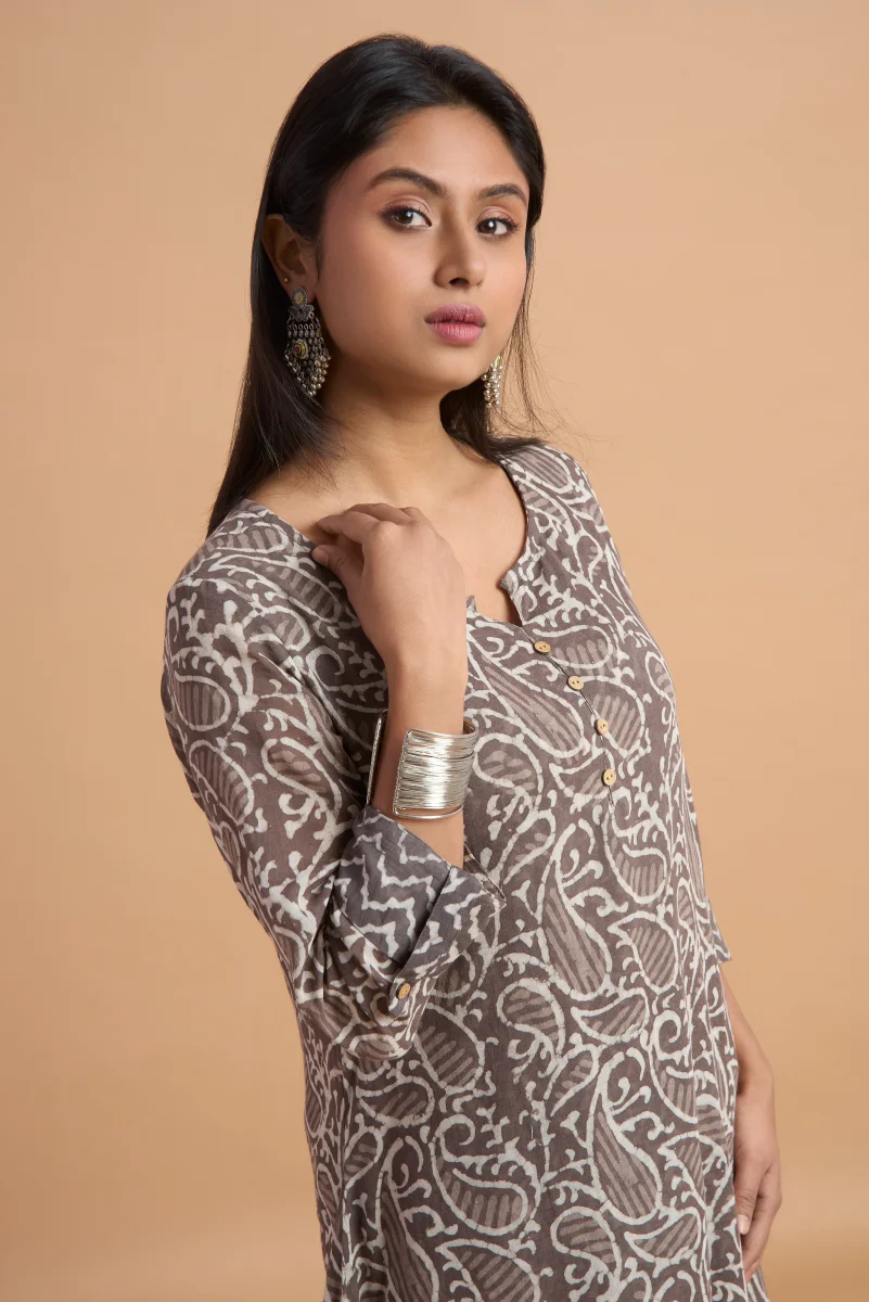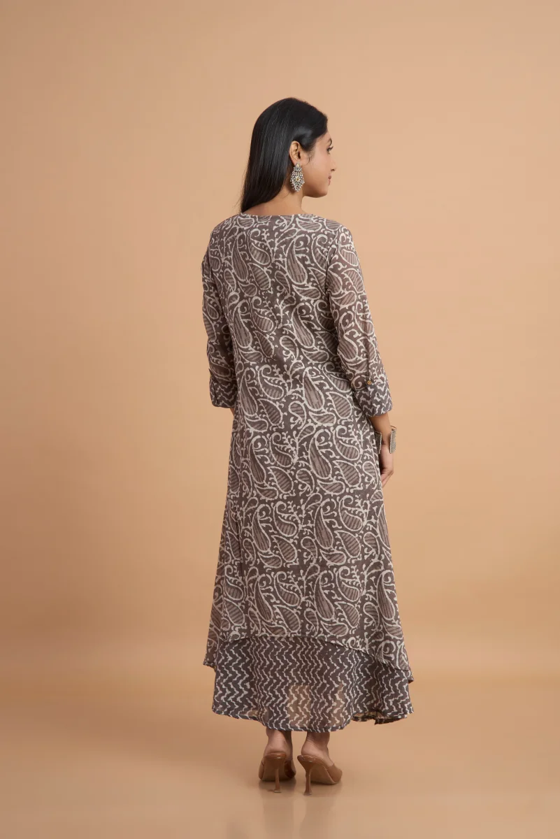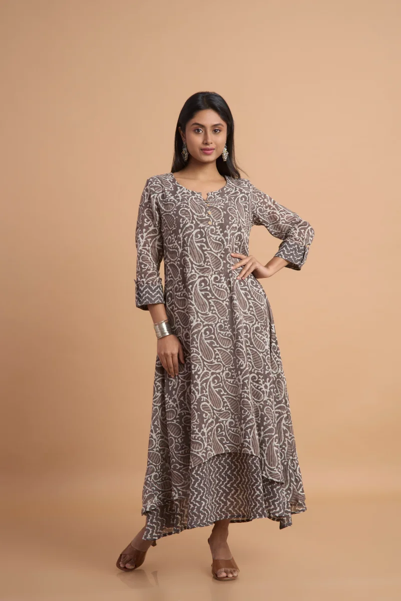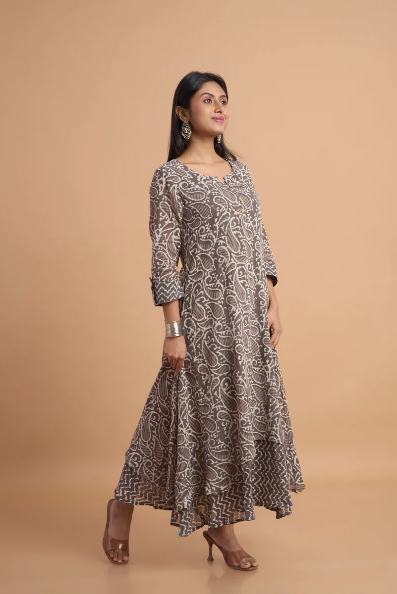 A breezy double-layered flare dress in soft cotton mull, featuring intricate hand block prints in rich Natural Kashish tones — where craftsmanship meets effortless movement.