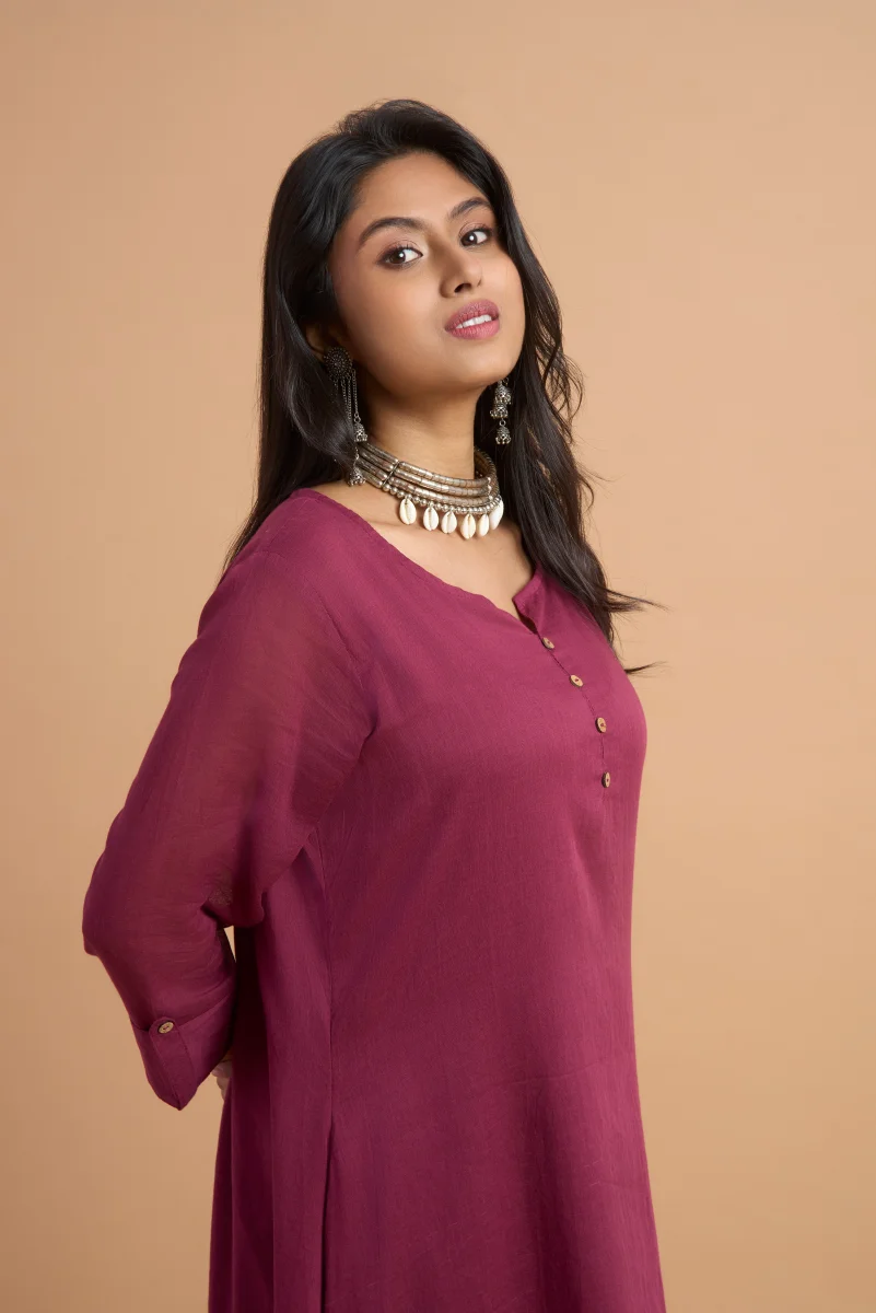 Crafted in 100% pure cotton, the Maroon Aura Double-Layered Dress is a perfect blend of comfort and understated elegance. Featuring a rich maroon plain-dyed finish, this dress is designed with a graceful double-layered silhouette that adds fluid movement and depth to the look. The breathable cotton fabric ensures all-day ease, while the minimalist design makes it versatile for festive gatherings, casual outings, or evening get-togethers. Style it with statement jewelry or keep it simple for a refined, timeless appeal.