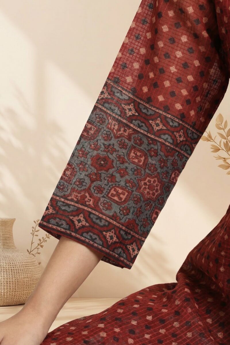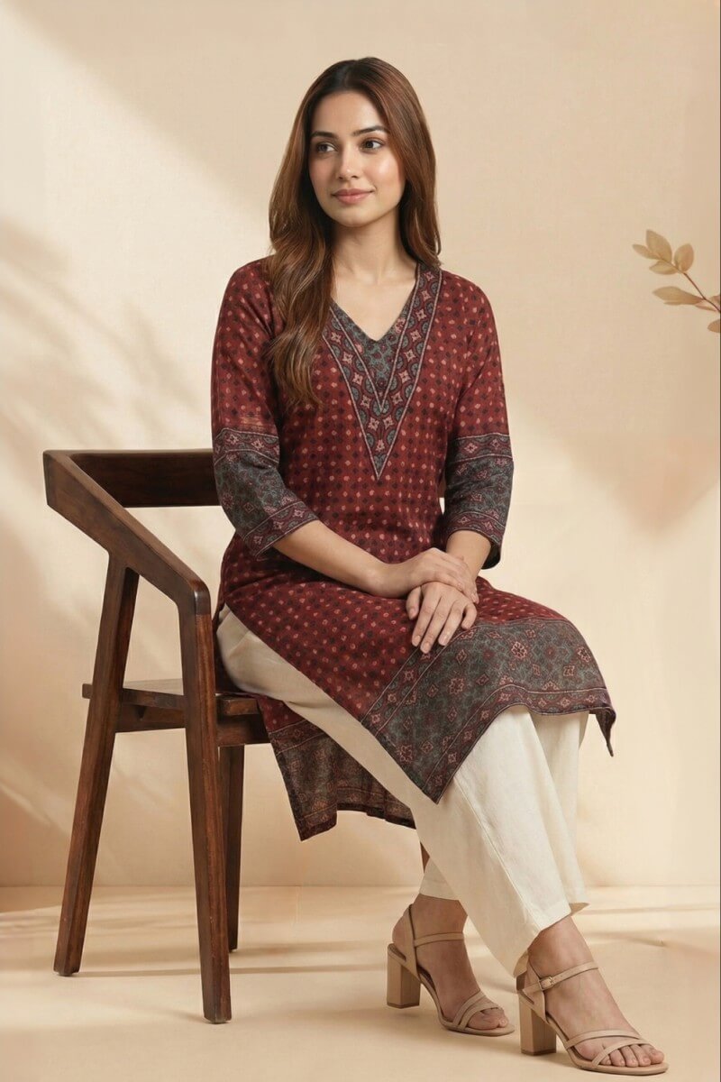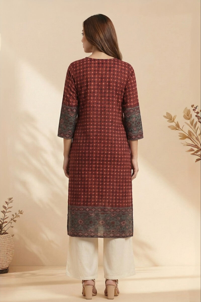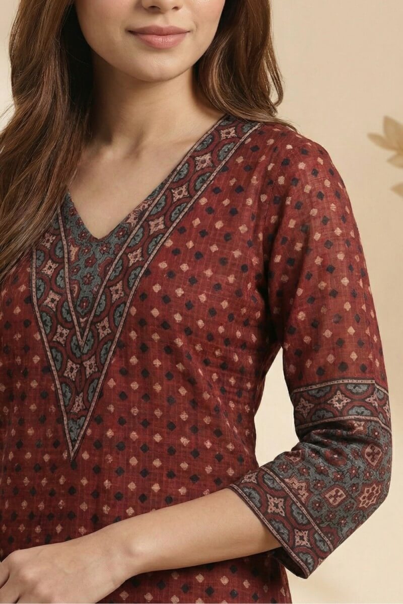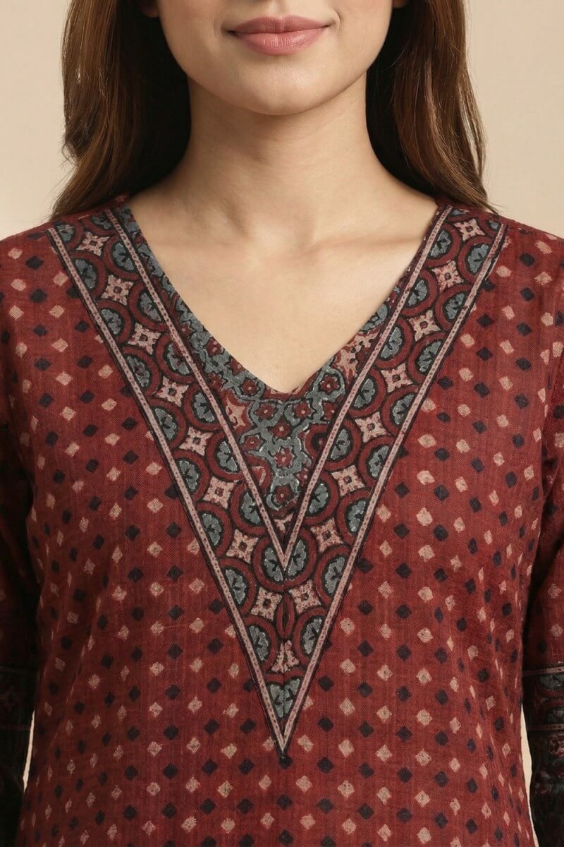 Embrace the richness of tradition with this cotton dobby kurta, featuring intricate hand Ajrakh prints in a deep maroon palette. Crafted from breathable, textured cotton, it offers superior comfort while adding a subtle depth to the fabric. The earthy maroon tones combined with detailed motifs create a warm, sophisticated look perfect for everyday wear or casual occasions. Designed with a relaxed, flattering silhouette, this kurta pairs effortlessly with straight pants or palazzos, making it a timeless addition to your wardrobe.