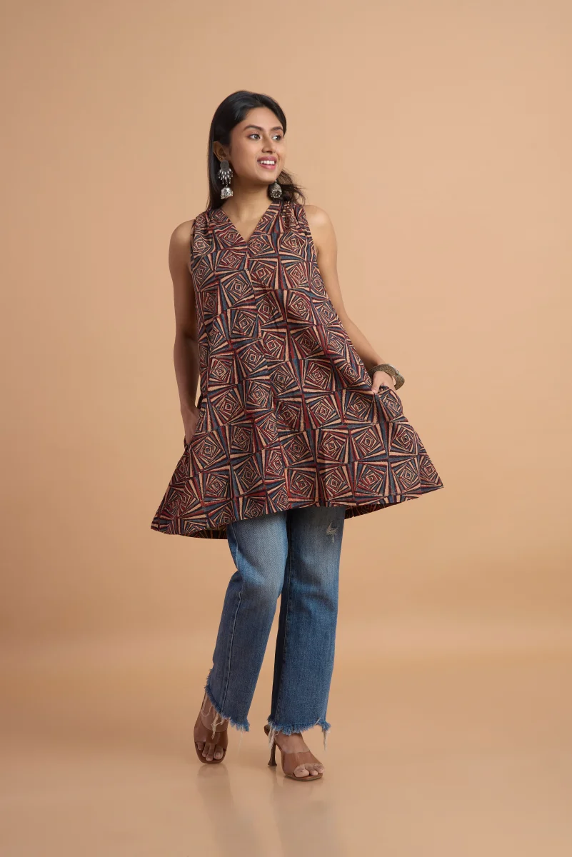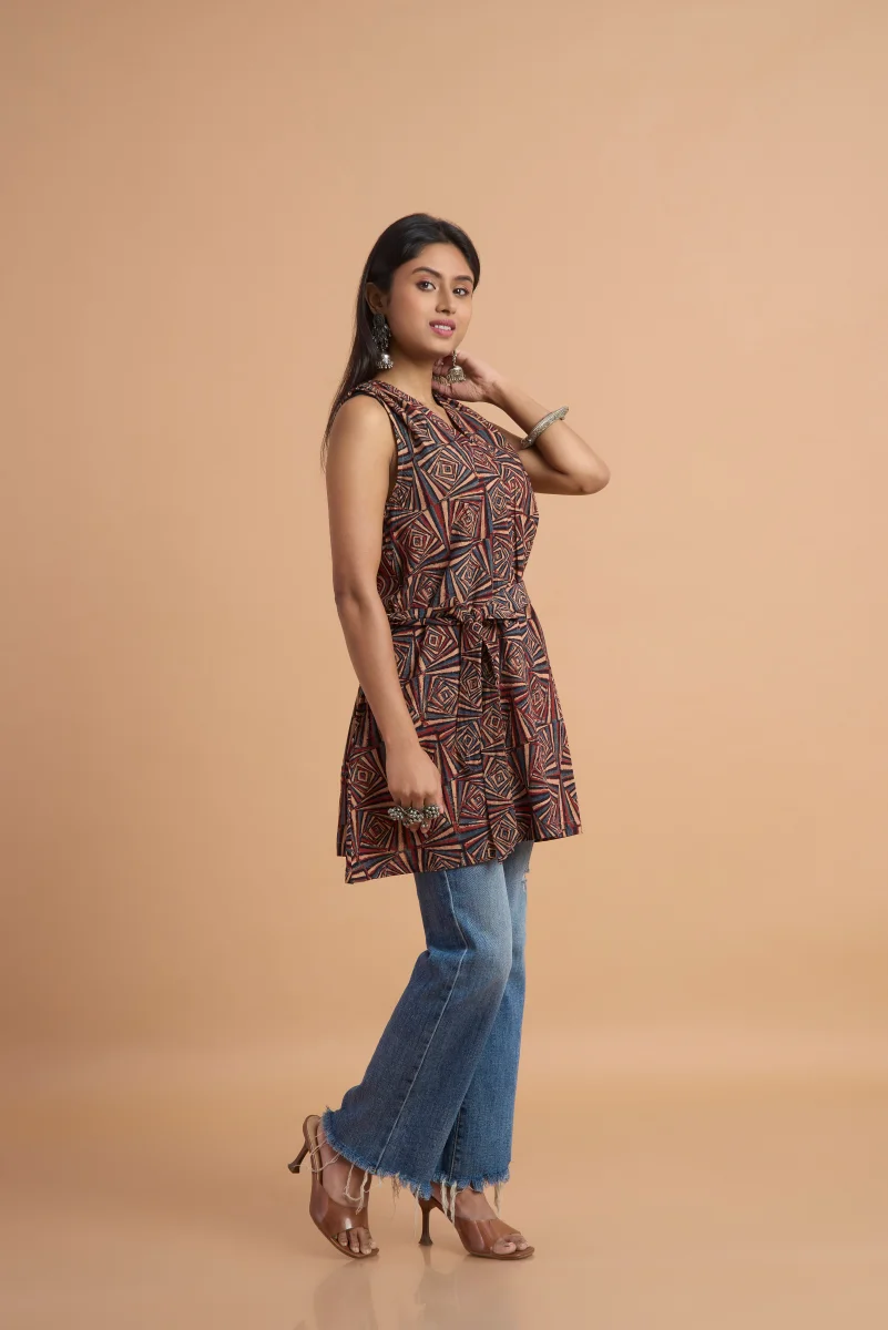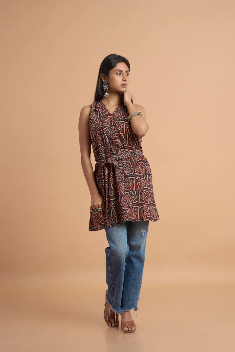 Celebrate the beauty of traditional craftsmanship with this striking Ajrakh print sleeveless tunic top. Handcrafted in rich, earthy tones, the top showcases the signature Ajrakh block-print motifs—intricate, symmetrical, and beautifully detailed—reflecting the timeless artistry of Kutch. Designed in a comfortable A-line silhouette, it features a mandarin collar, front buttons, and a side drawstring tie that allows you to adjust the fit for a flattering, cinched look. The sleeveless cut keeps the outfit light and modern, making it perfect for daily wear, travel, or chic Indo-fusion styling with jeans or straight pants. Versatile, artisanal, and effortlessly stylish—this Ajrakh tunic brings heritage craft to contemporary fashion with ease.