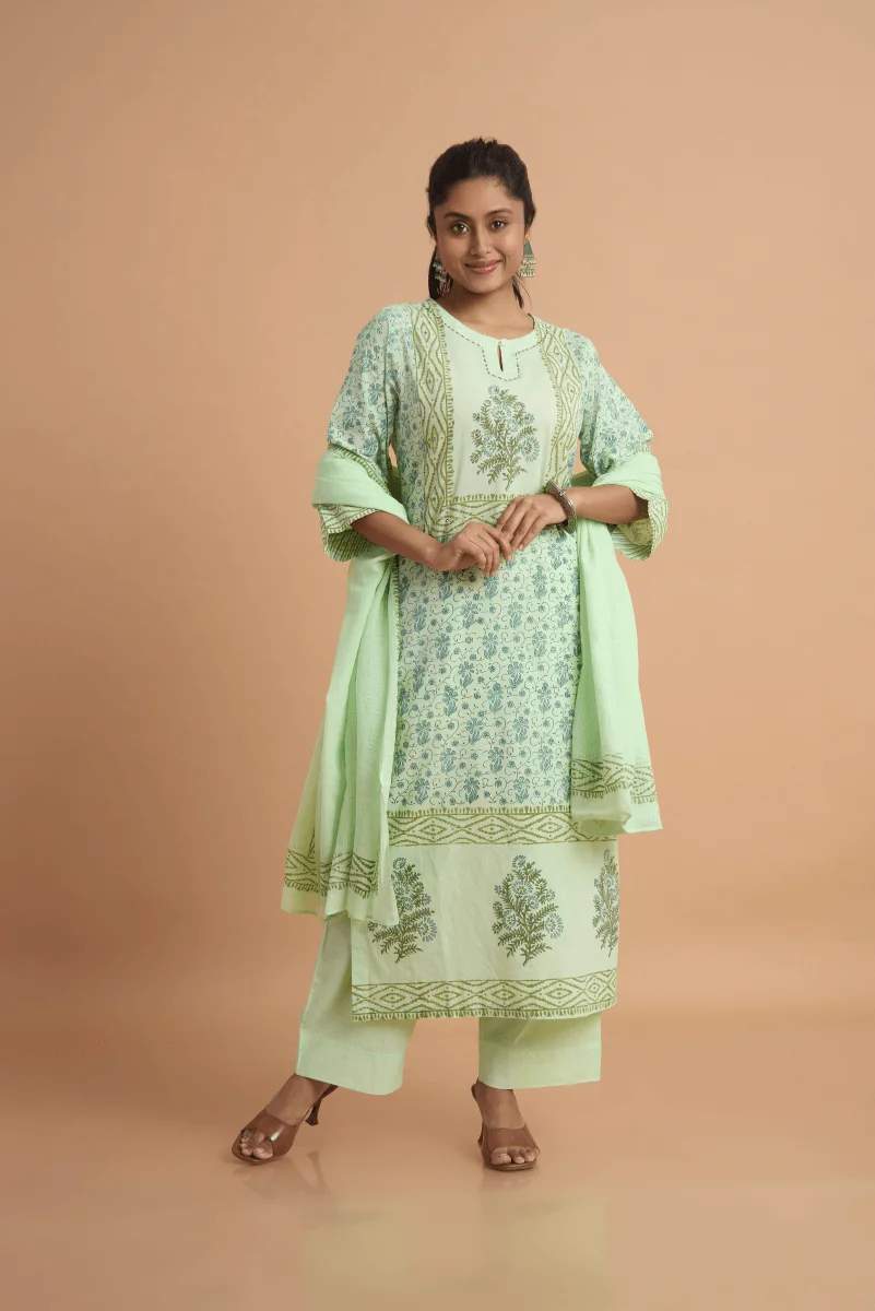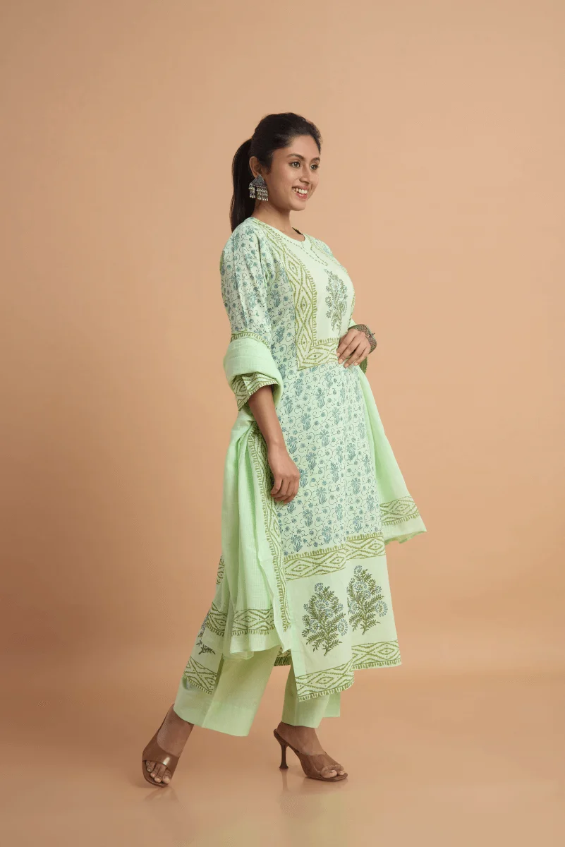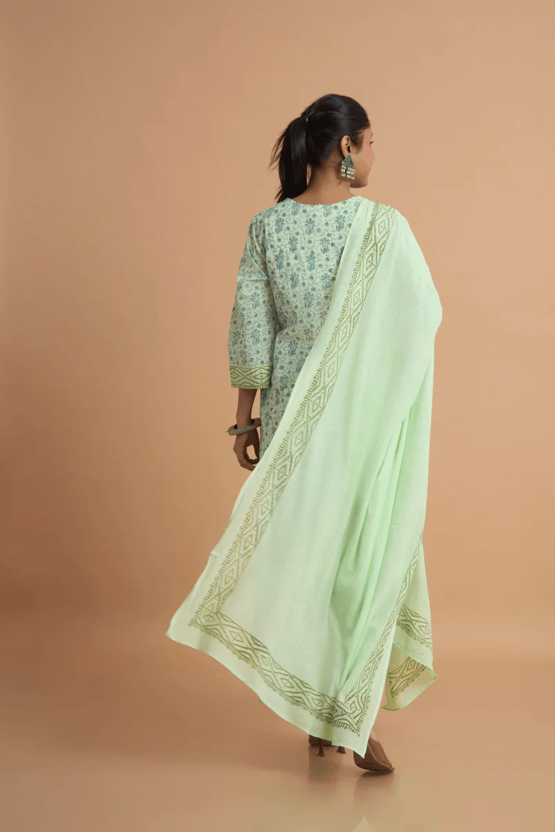 Artisanal in detail and soothing in colour, this handcrafted 3-piece suit set in mint green is a celebration of Indian textile legacy. The kurta showcases carefully aligned block prints in floral butas and borders, highlighted with hand-done Adda embroidery on the yoke and neckline — adding an elegant shimmer and textural charm.