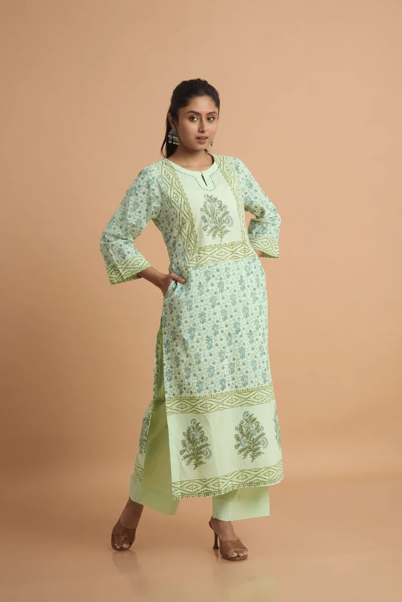 Mint Green Hand Block Placement Print Suit Set with Adda Embroidery