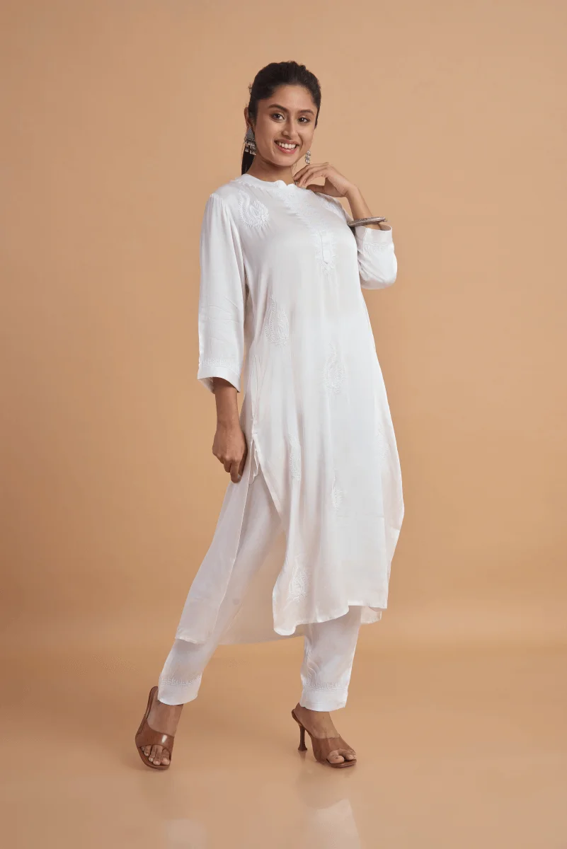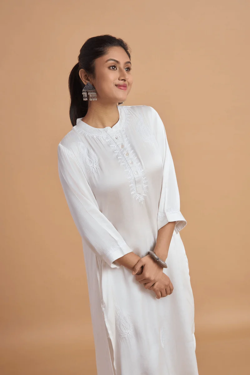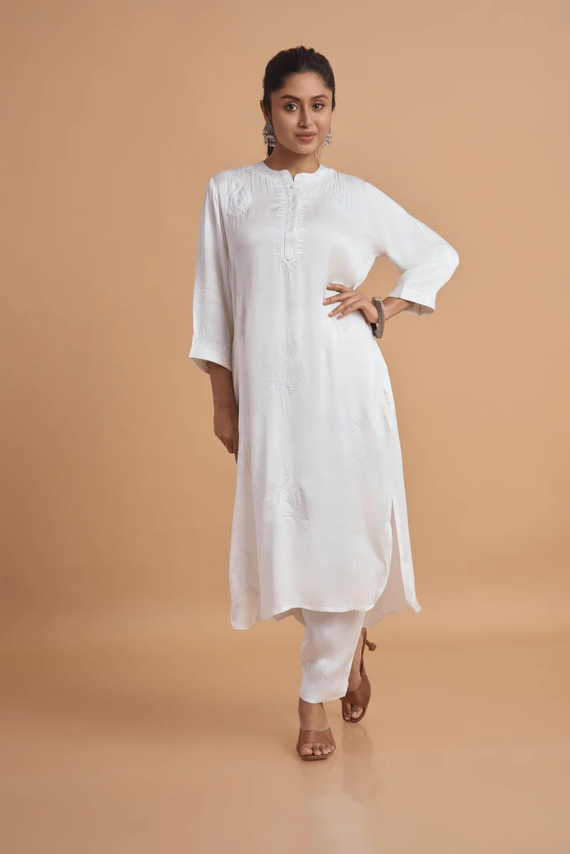 Experience the charm of delicate craftsmanship with this elegant white Murri work kurta, thoughtfully designed for effortless sophistication. Crafted in fine fabric, the kurta features subtle yet intricate Murri embroidery along the yoke, neckline, and sleeves—highlighting the beauty of handwork while maintaining a clean, minimal aesthetic. The long straight silhouette drapes gracefully, offering both comfort and refined style. The three-quarter sleeves carry light embroidered detailing that enhances the overall elegance without overpowering the simplicity of the piece. Paired with matching white pants, this kurta set is perfect for festive occasions, daytime celebrations, or serene everyday wear. Soft, lightweight, and timeless—this Murri work kurta is a wardrobe essential for those who appreciate understated luxury.