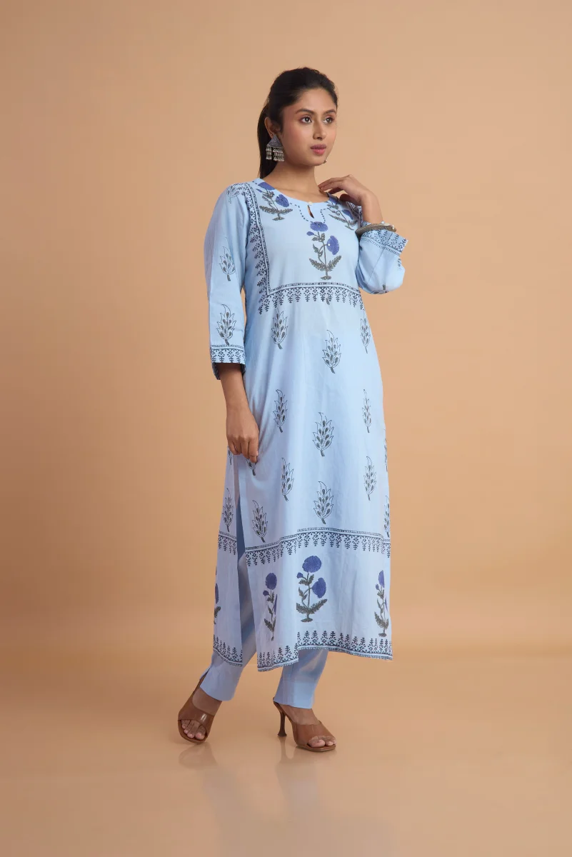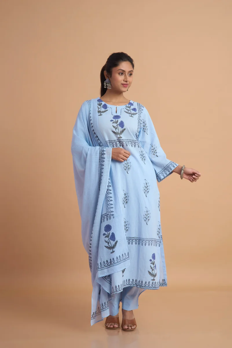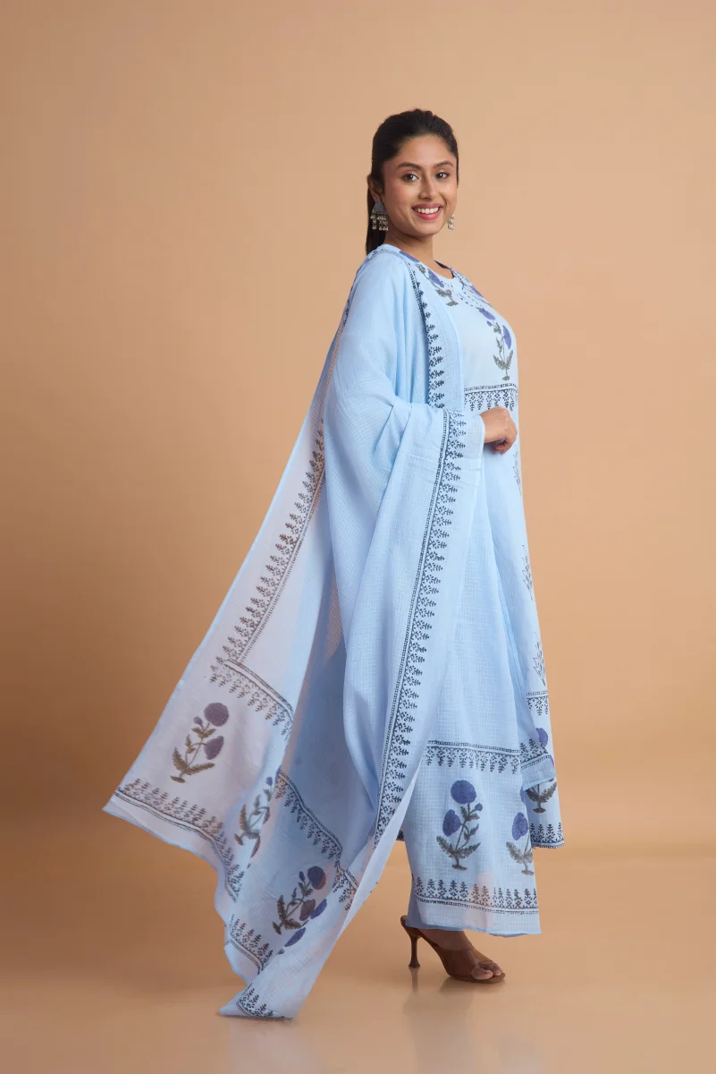 The Neelara Garden Pant Set is crafted from 100% breathable cotton and adorned with delicate hand block prints that celebrate timeless artistry. Featuring a graceful kurta paired with comfortable straight pants and a softly draped dupatta, this ensemble blends elegance with everyday ease. The soothing blue palette and floral motifs make it perfect for daytime gatherings, festive lunches, or relaxed celebrations, offering comfort, charm, and artisanal beauty in every detail.