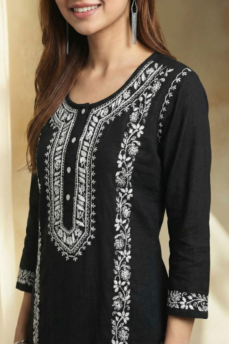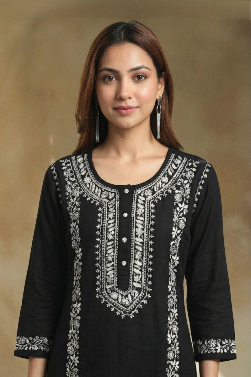 Experience timeless sophistication with the Noir Elegance Hand Chikankari Cotton Kurta Set, crafted from 100% pure cotton for breathable, all-day comfort. Rendered in a classic black hue, this kurta is adorned with intricate hand chikankari embroidery that beautifully highlights traditional artistry. The straight, elegant silhouette offers a refined look, making it ideal for festive occasions, cultural gatherings, or graceful everyday wear. Pair it with minimal accessories to let the detailed craftsmanship stand out, or elevate it with silver jewelry for a striking ethnic statement.