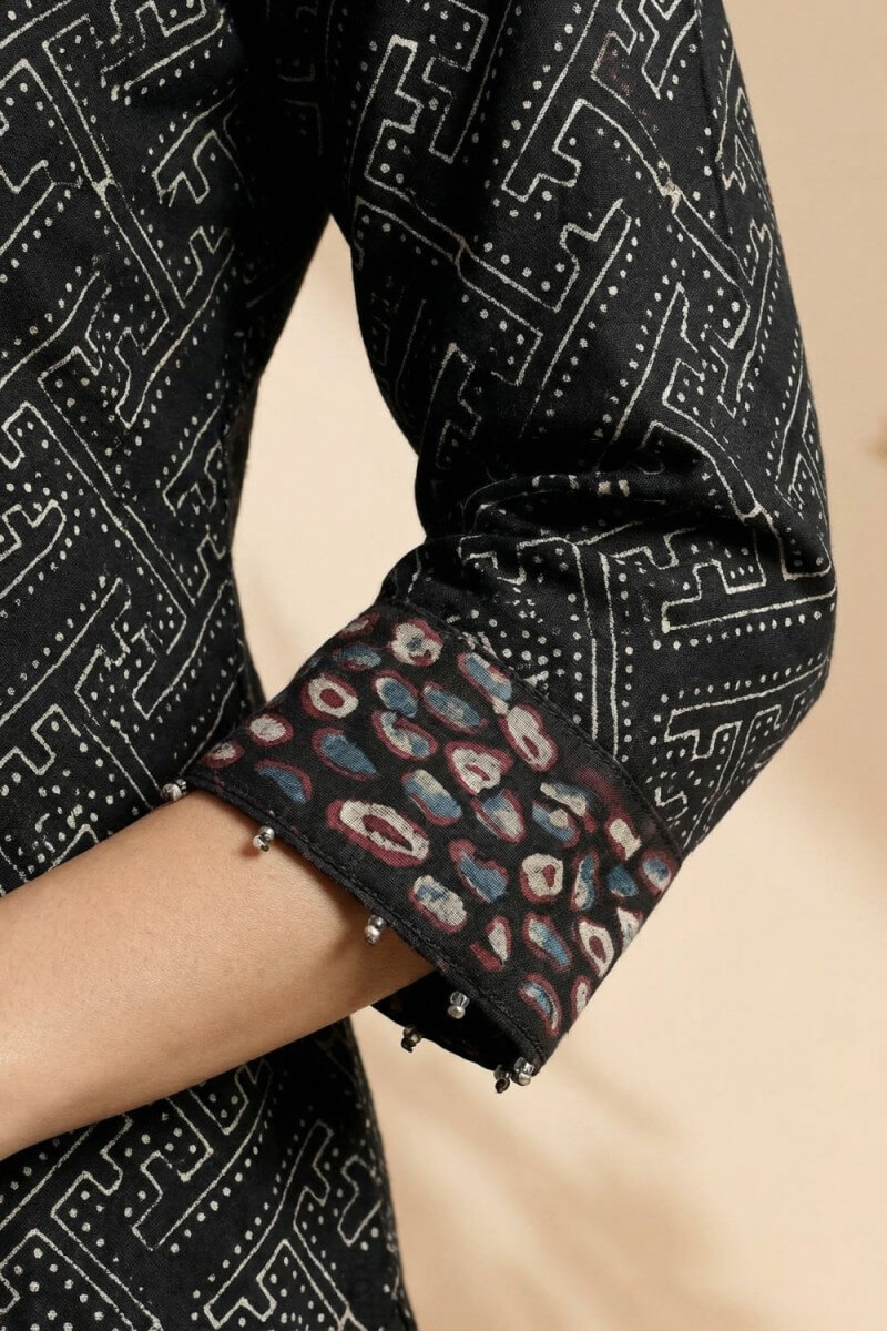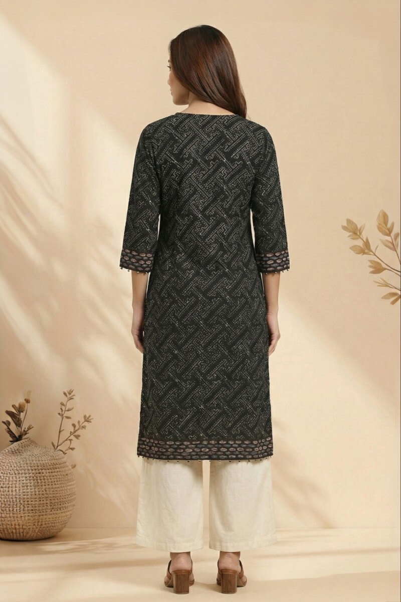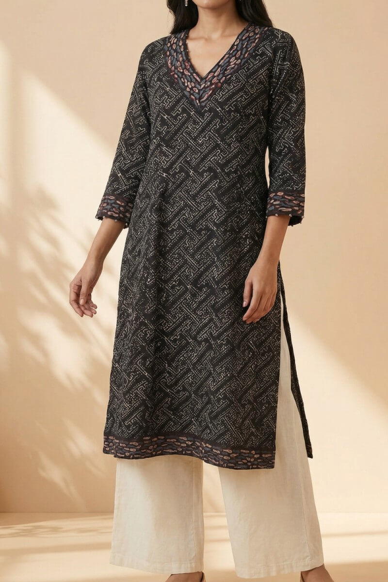 Crafted from textured cotton dobby, this black kurta showcases the timeless beauty of hand Ajrakh print in a refined, contemporary silhouette. Designed with a flattering V-neckline and three-quarter sleeves, it features intricate geometric motifs that highlight traditional craftsmanship. The breathable fabric ensures all-day comfort, while the straight cut offers effortless elegance for work or casual outings. Pair it with neutral trousers or palazzos to create a versatile look that blends heritage artistry with modern sophistication.