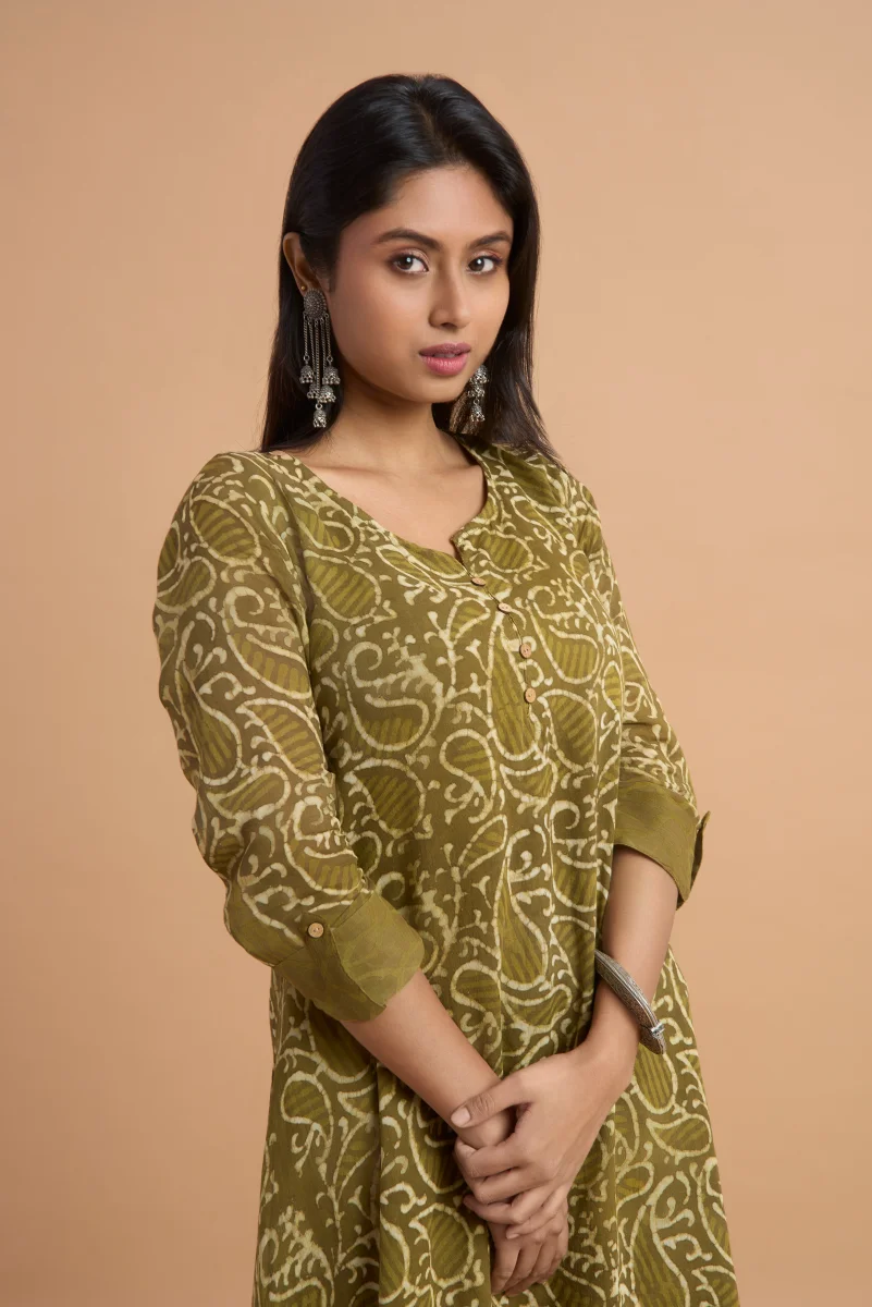 Crafted from 100% pure cotton, this double-layered hand block print kurti blends traditional artistry with graceful movement. Designed in an elegant olive green tone, it features intricate all-over motifs, a classic V-neckline with button detailing, and three-quarter sleeves for a refined silhouette. The layered hem adds depth and fluidity, making it both stylish and comfortable. Breathable and lightweight, this kurti is perfect for everyday wear, festive gatherings, or cultural occasions. Pair it with minimal jewellery and flats for an effortlessly elegant ethnic look.