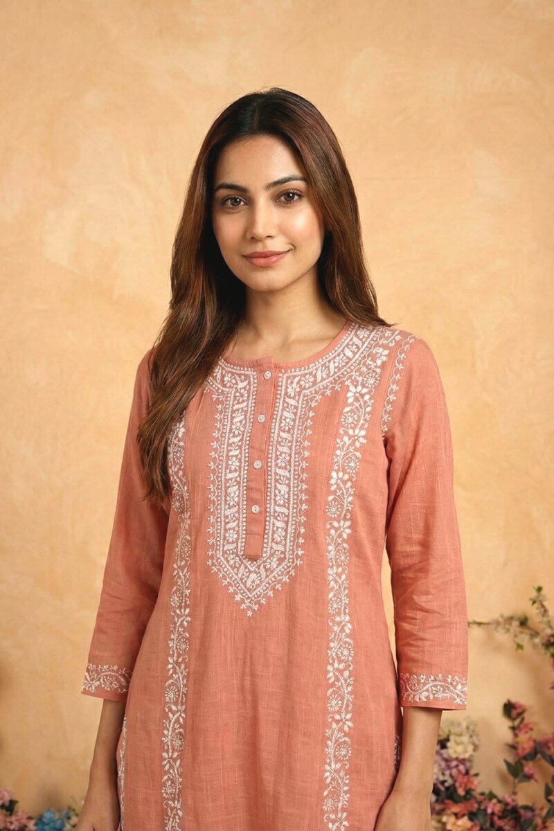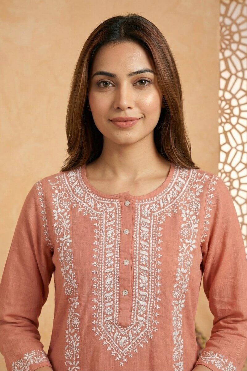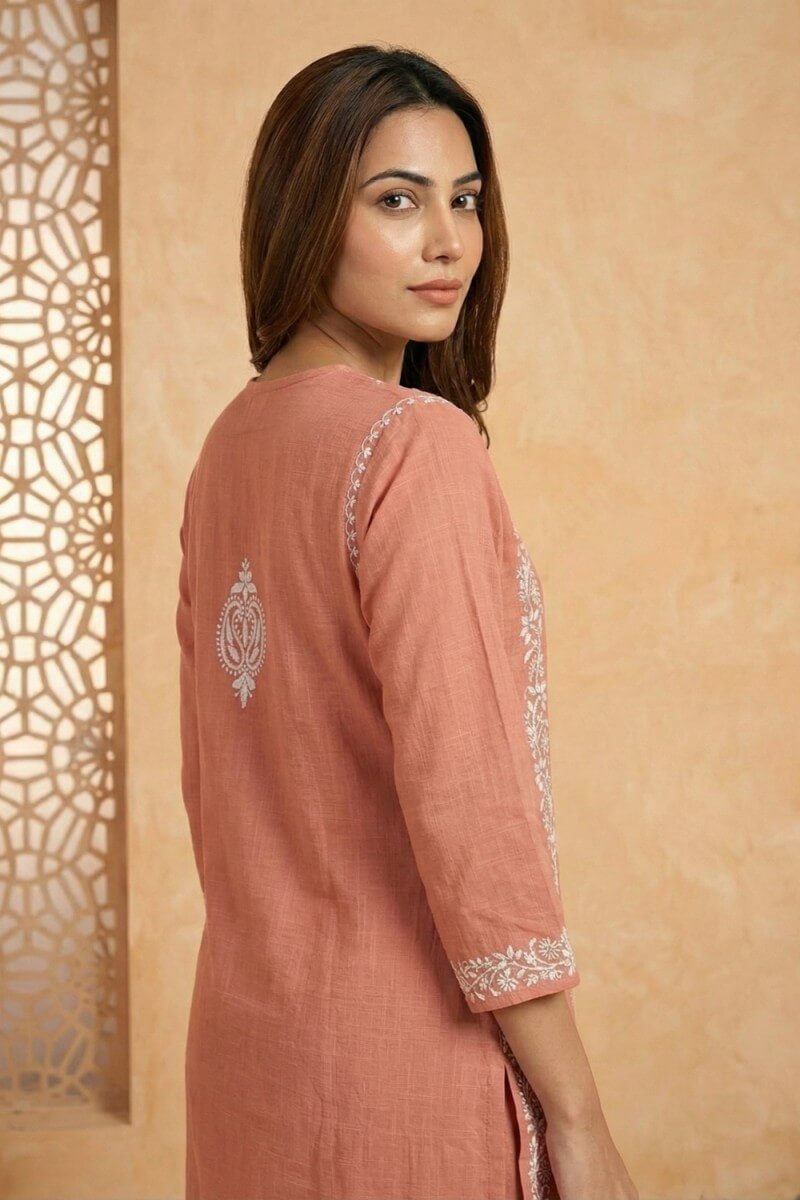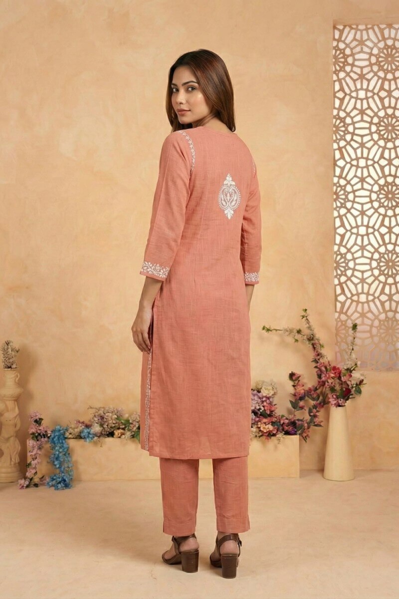 Embrace understated elegance with this beautifully crafted 2-piece kurta set, made from 100% cotton slub for a naturally textured and breathable feel. Drenched in a soft peach hue, the kurta is adorned with intricate hand chikankari embroidery that adds a touch of timeless grace and delicate craftsmanship. Designed with a straight silhouette, detailed neckline, and comfortable three-quarter sleeves, it pairs effortlessly with matching pants for a refined, coordinated look.