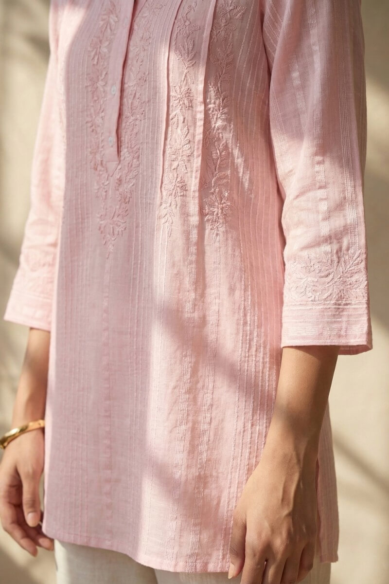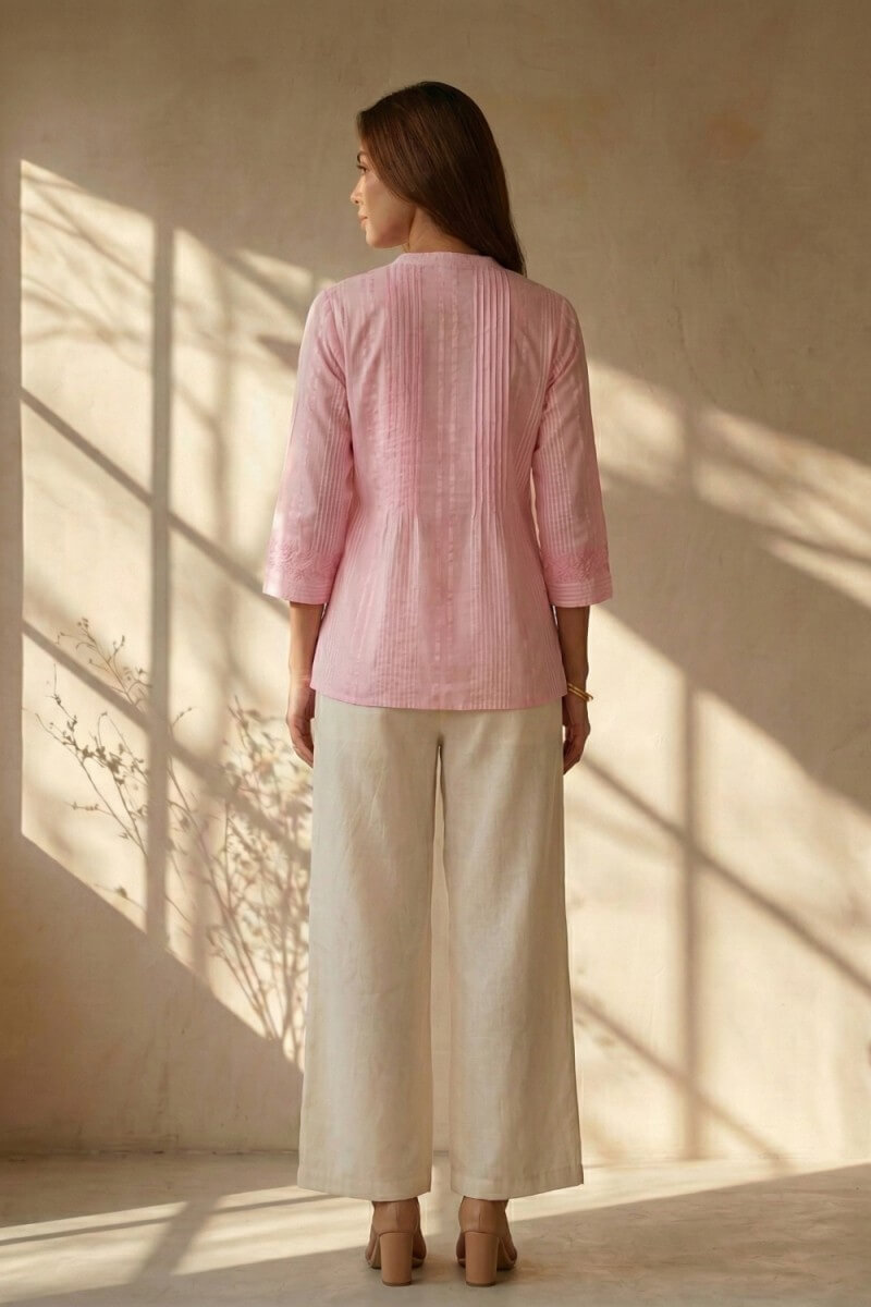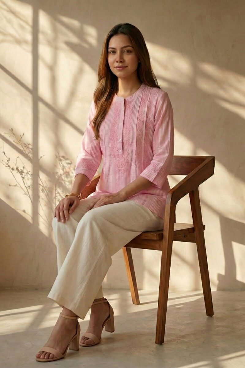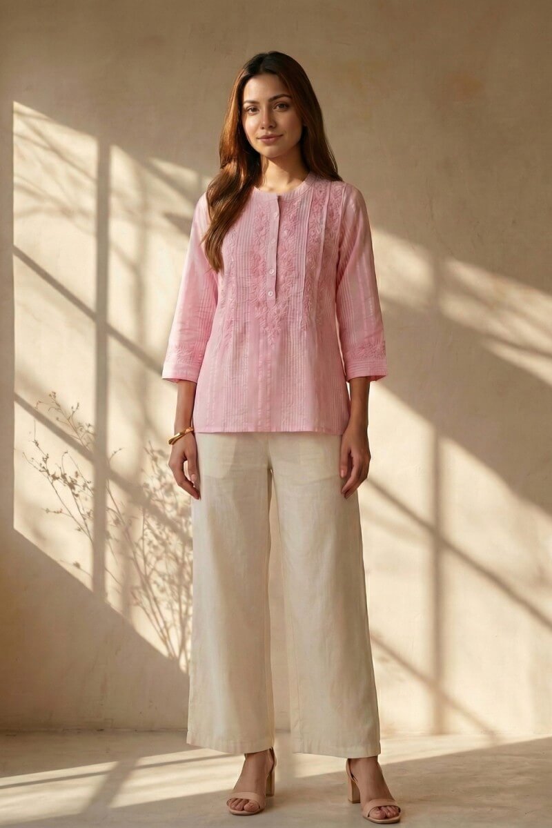 Crafted in 100% pure cotton, this elegant top features delicate hand chikankari embroidery that highlights timeless craftsmanship. The soft blush tone paired with fine pintuck detailing on the front creates a refined yet effortless look. Designed with a straight silhouette, three-quarter sleeves, and a minimal neckline, it offers both comfort and sophistication for everyday wear. Light, breathable, and versatile, this top pairs beautifully with trousers or palazzos—making it a perfect choice for relaxed days with a touch of understated elegance.