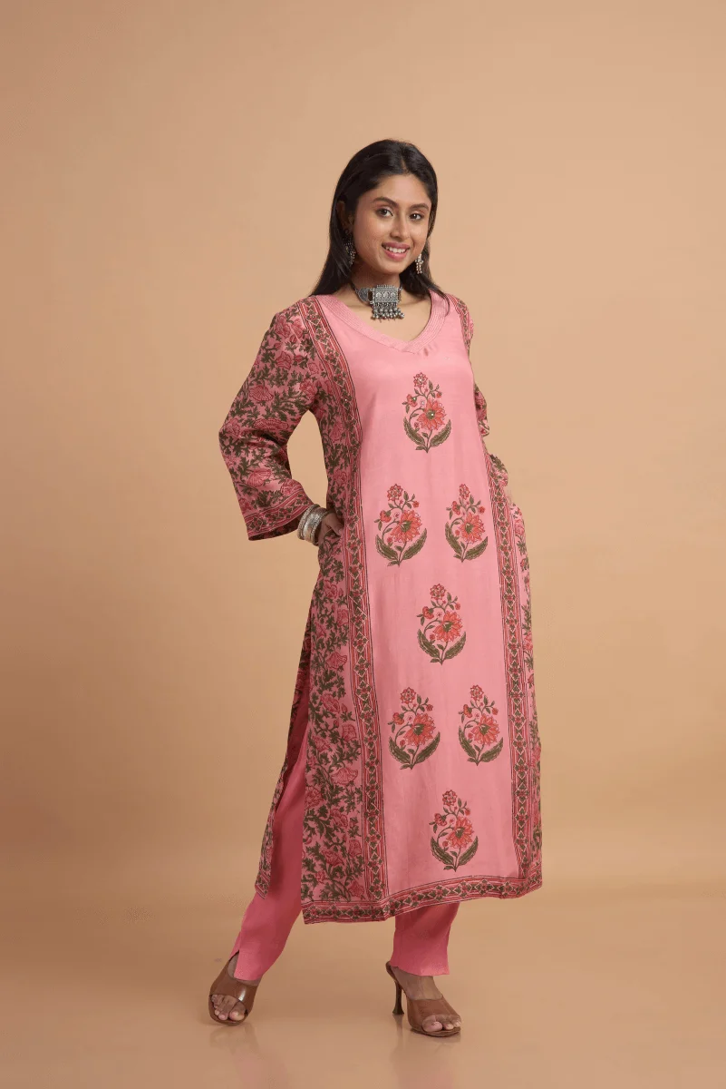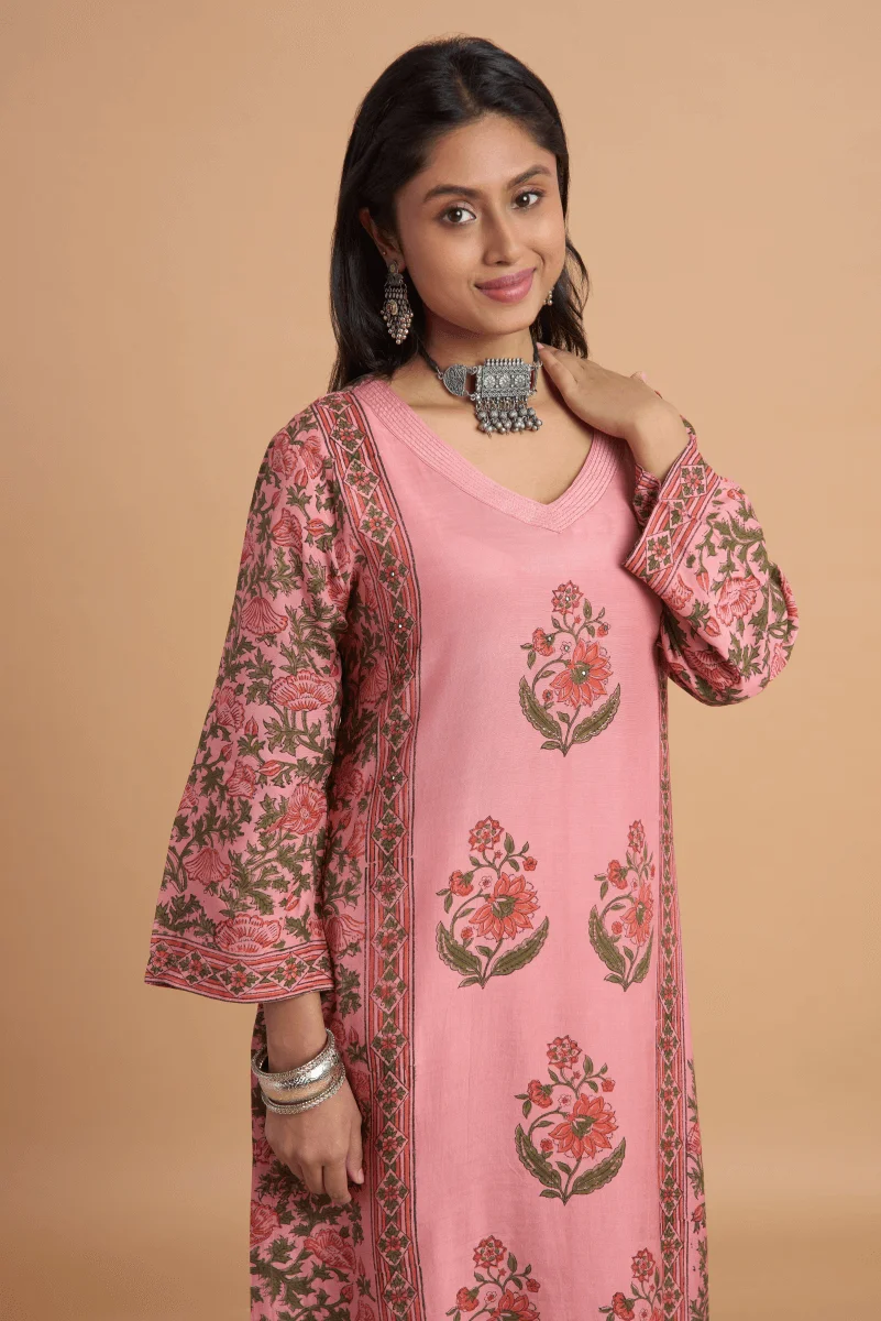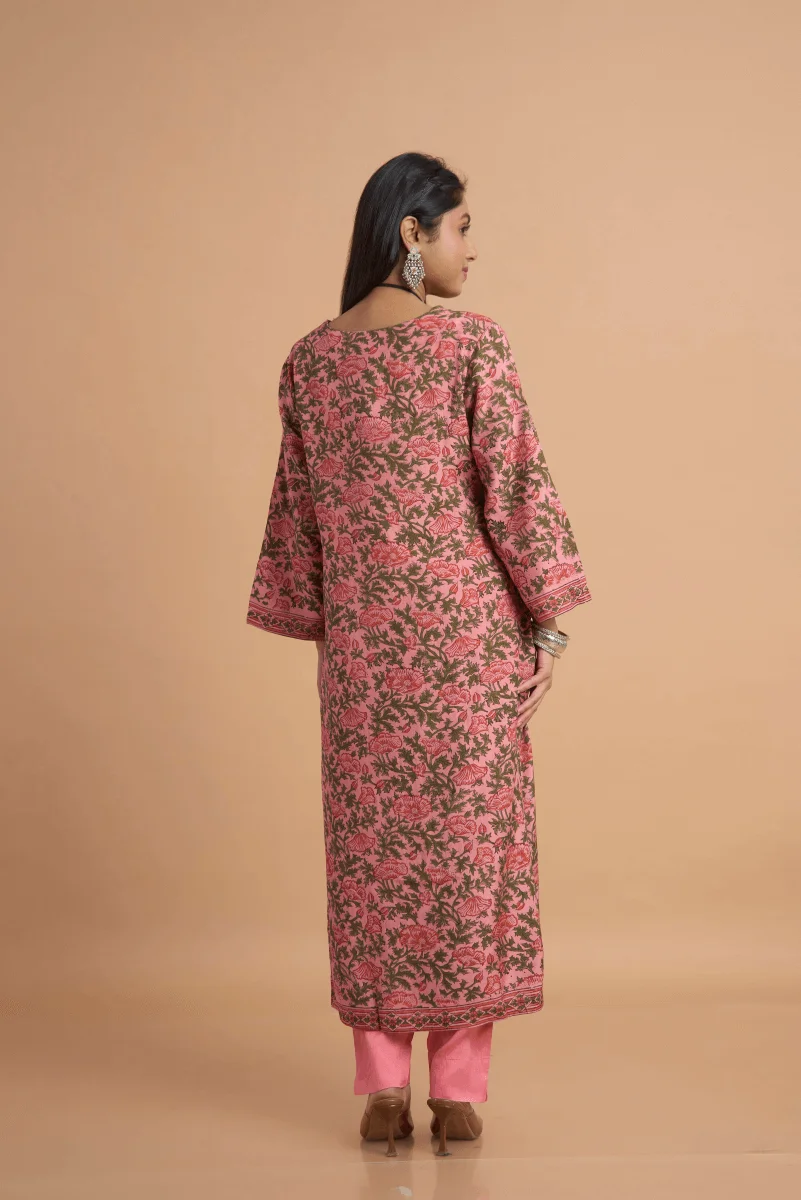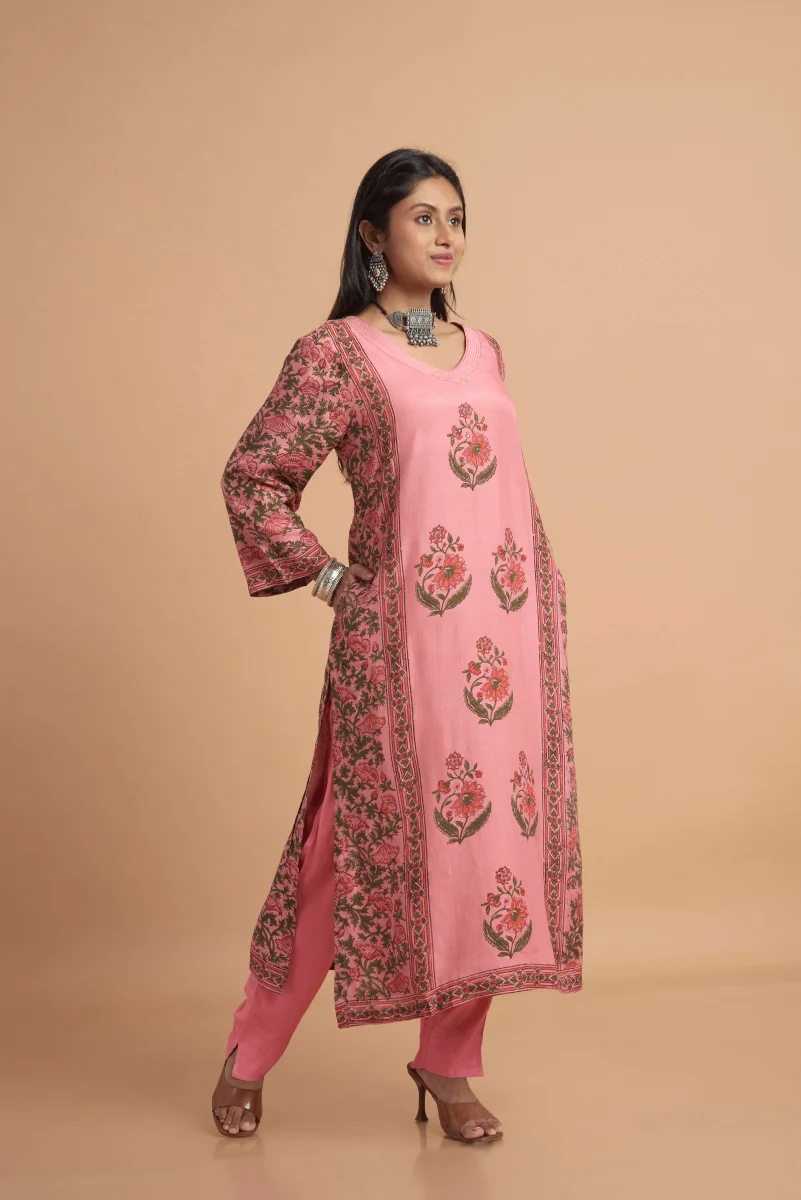 Experience the grace of flowing fabric and heritage craft in this beautifully designed kurta set made from muslin satin — known for its soft texture and subtle sheen. The rose pink base serves as the perfect canvas for bold hand block placement prints, arranged in symmetrical vertical motifs along the front and side panels, while the sleeves and border are richly detailed with traditional floral vines.