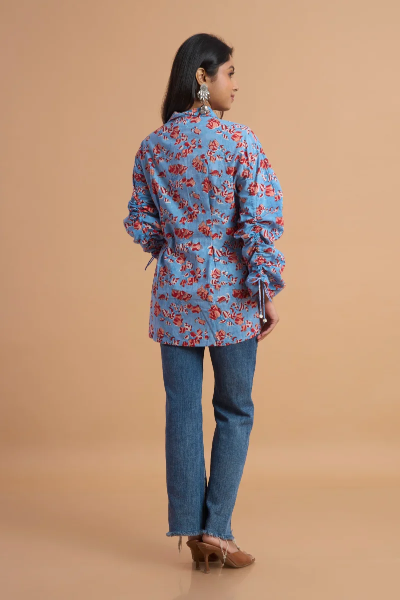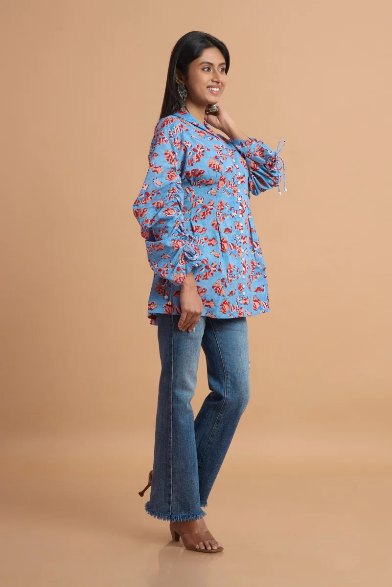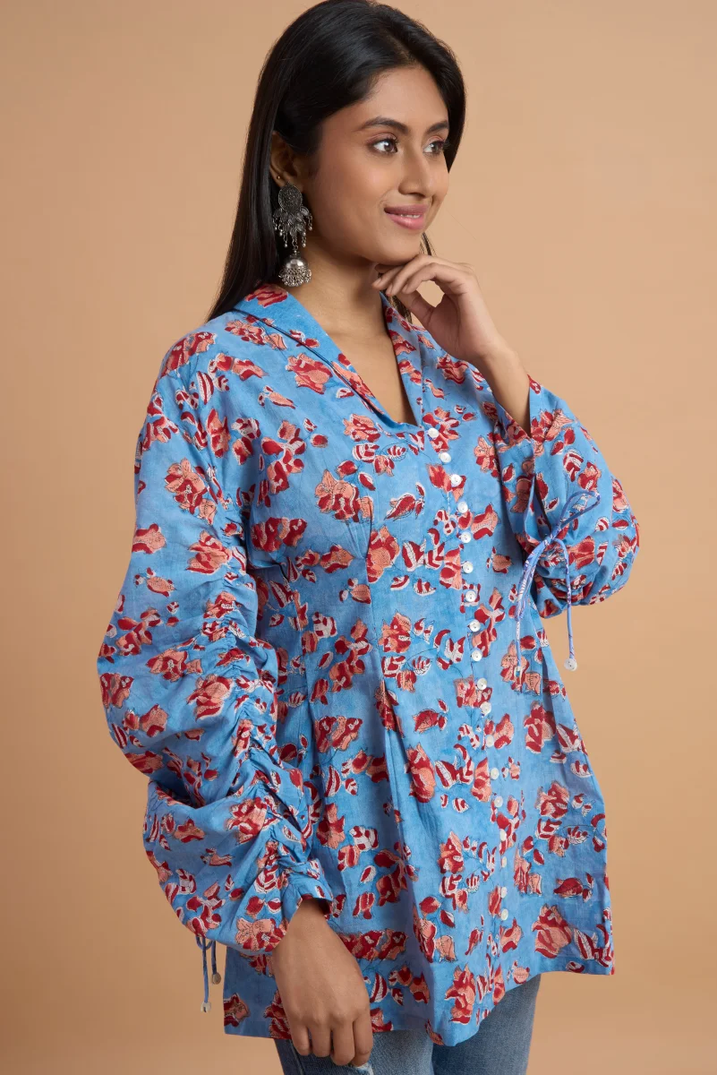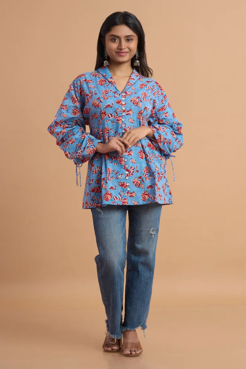 Refresh your everyday wardrobe with this elegant hand block print cotton top, crafted from soft, breathable cotton fabric. Featuring a soothing sky-blue base adorned with delicate floral motifs, this top blends traditional artistry with a modern silhouette. The relaxed fit, subtle V-neckline, and adjustable tie-up sleeve details add effortless charm and comfort. Perfect for casual outings, workdays, or weekend get-togethers, this versatile top pairs beautifully with jeans, trousers, or ethnic bottoms for a timeless, graceful look.
